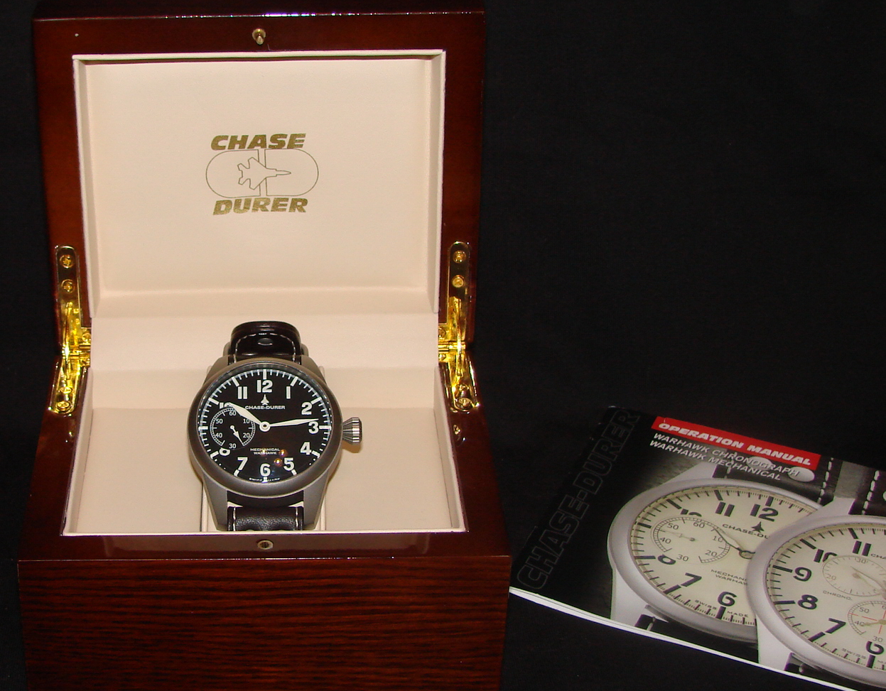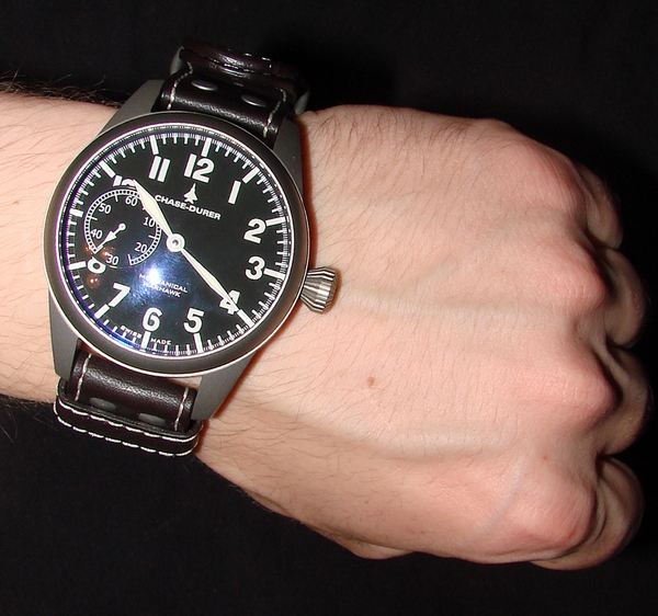 Сегодня вашему вниманию хочу представить своего большого пилота Chase Durer Warhawk Mechanical http://www.chase-durer.com. В моей семье это уже 3-и часы этого производителя. Итак, технические характеристики: Unitas 6497, ручка, запас хода составляет примерно 44 ч. Механизм заключен в титановый корпус размером 50 мм без заводной головки, она не закручивается, заводятся часы очень мягко. На копрусе есть надпись о водонепроницаемости до 100 метров. Стекло выпуклое - не сапфир, а кристалл «К1» (это видимо класс стекла по прочности. Поправьте, если не прав.), который покрыт антибликовым составом. Циферблат черный, цифры и стрелки обильно выкрашены в люминесцентный состав. Ремешок сделан из натуральной кожи, ширина 22 мм, цвет- шоколад. Очень мягкий на ощупь. Цена с 30% скидкой вылилась в 625$+50$ за доп. ремешок+57$ налог штата. Большое спасибо Pusher за помощь в доставке.;) И конечно традиционные фото: Вложение 14506Вложение 14508Вложение 14509Вложение 14510 Вложение 14512Вложение 14513 Вложение 14514Вложение 14515Вложение 14516Вложение 14517 |
