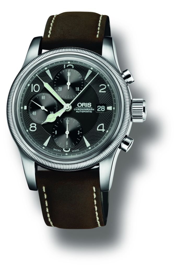 Корпус у новинки круглый, изготовленный из нержавеющей стали, с рифленым фиксированным безелем, диаметром 42,00 мм, водонепроницаемый до 30 метров. Рифленая заводная головка расположена на 3 часах, пушеры хронографа - на 2 и 4 часах. Задняя крышка корпуса гравированная. Выпуклое плексигласовое стекло защищает гильошированный циферблат матово-черного цвета, с накладными арабскими цифрами, часовыми индексами, часовой и минутной стрелками, покрытыми люминесцентным составом SuperLumiNova светло-зеленого цвета. Модель оснащена швейцарским автоматическим механизмом ORIS 774 (базовый калибр SW500), с функциями индикации часов, минут (посредством соответствующих центральных стрелок), секунд (на малом боковом циферблате, расположенном на 9 часах), даты (посредством соответствующего цифрового указателя в апертуре, расположенной на 3 часах), а также с хронографом (центральная секундная стрелка, 30-минутный счетчик, расположенный на 12 часах и 12-часовый счетчик, расположенный на 6 часах). Поставляется на темно-коричневом кожаном ремешке с белой прошивкой и с застежкой из нержавеющей стали. Лимитированный выпуск 300 экземпляров. Цена модели составляет 2500 швейцарских франков. Источник: http://www.horozima.com/2013/06/oris...urce=BP_recent |