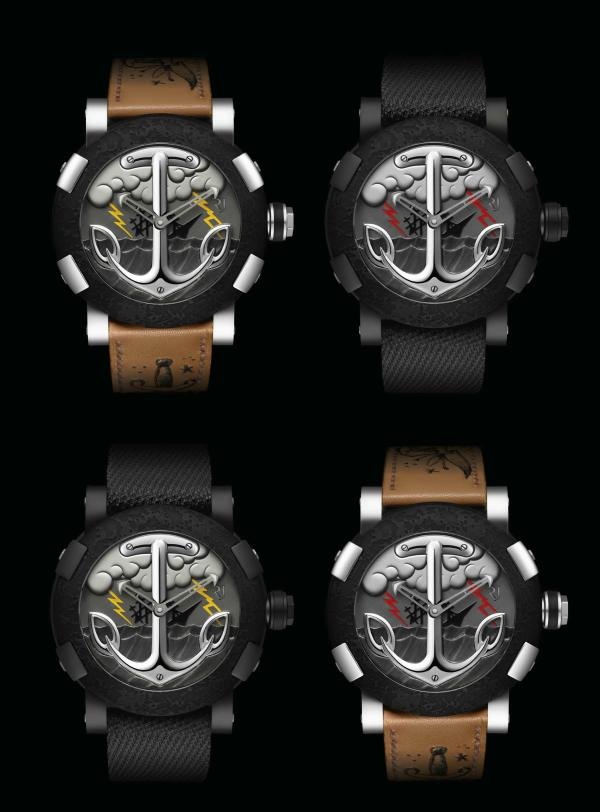 Корпус у новинки круглый, изготовленный из нержавеющей стали или из нержавеющей стали с черным PVD-покрытием, диаметром 50 мм, водонепроницаемый до 30 метров. Сапфировое стекло защищает трехмерный циферблат темно-серого цвета, отделанный в техниках гравирования, лакирования, родирования. На переднем плане имеется крупное накладное изображение якоря, на заднем плане - тонущее в бурном море парусное судно, тучи и молнии. Стрелки скелетонизированные, с указателями, покрытыми люминесцентным составом белого цвета. Модель оснащена швейцарским автоматическим механизмом Romain Jerome RJ001-A, на 23 камнях, с балансовой частотой 28800 полуколебаний в час (4 гц), 42-часовым запасом хода, функциями индикации часов и минут (посредством соответствующих центральных стрелок). Поставляется на ремешке из черной ткани или из кожи с изображением татуировки Mo Coppoletta, с раскладной застежкой из из нержавеющей стали или из нержавеющей стали с черным PVD-покрытием. Лимитированный выпуск 25 экземпляров. MSRP модели составляет $ 18450. Источник: http://forums.timezone.com/index.php...=0#msg_6607551 |
