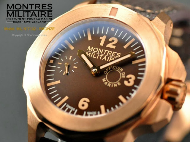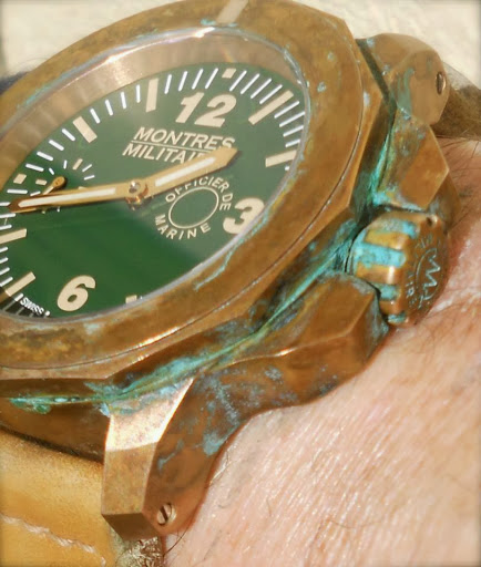 Новый швейцарский производитель часов Montres-Militaire выпустил свои первые часы Bronze Officier de Marine. Часы жестоко эксплуатируют народную любовь к военно-морской тематике, к Panerai и модному материалу - бронзе. Главной фишкой этих часов является последняя. По уверению Markus Tschopp (акционера и генерального директора Montres-Militaire) покупателя было решено удивлять правильной, самой настоящей бронзой. Только медь и олово, никакого цинка или железа. Настоящую бронзу долго выбирали у двадцати производителей, пока не остановились на этой. В результате корпус часов, диаметром 47 мм и толщиной 14,5 мм, покрывается правильной, благородной патиной. Вид, которой кому-то может нравится, а кому-то и наборот.