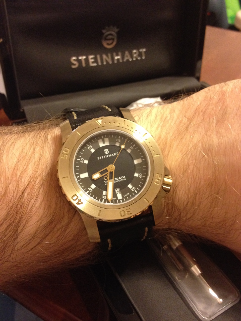 Фотографий уже было выложено много, с разных ракурсов часами вы все успели насладиться, поэтому дальше будут в основном буковки. Часы идут в красивой коробке, которая, сразу у жены вызвала один вопрос "где теперь ее хранить?" ;) Вытащив часы из коробки я сраз сфотографировал их на руке отдельно и в сравнении с немаленькими Шоками. Вложение 534736 Как видите, рука у меня небольшая, поэтому сначала были сомнения не великоваты ли мне часы. Но т.к. "оверсайз" мне по душе, то тут проблем не возникает. Дату на момент вотографирования я еще не перевел. Вложение 534737 Удивительно, но на фотке Шоки смотрятся больше Тритона. Хотя в жизни Тритон смотрится куда более вшунительной шайбой. Вложение 534738 Номер мне достался 39 из 111. Фотография с неснятой пленкой Общеее впечатление. При всей неоднозначности, которую может вызывать дизайн Штайнхарта (мне активно не нравится,например, гоночная коллекция) часы выглядят солидно. Когда сегодня коллеги увидели новые часы на руке и поинтересовались стоимостью, то однозначно сказали, что часы выглядят больше чем на 700 Евро. Хочу отметить, что у Гюнтера хороший фотограф, в том смысле, что фото дают наглядное представление о часах. Единственно, чего я не ожидал, что задний сапфир маловат, а уж синенные винты совсем мелковаты. Корпус. Вот уж точно сильное и ценляющее качество этих часов. Плавные формы бронзового литья гармонично сочетаются с рисками безеля и заводной головки. Индивидуальный номер на боковой поверхности корпуса всегди виден и греет душу:o. Циферблат. Можно сказать, что он просто симпатшишный. Единственно, что сендвичность иногда на дату откидывает неровную тень. Сама дата довольно интересно на мой вкус реализована. Хочу тут отметить, что дата - это мой "пунктик", и без нее с высокой вероятностью я часы не куплю (поэтому Пилотов и Морских офицеров пока не прикупил), выполнена интересно. Хотя шрифт даты мелкий, но считывается легко и без проблем. Стрелки, как всегда, то место, к которому можно прикопаться. С точки зрения дизайна они легковесны на фоне мощного корпуса, а с точки зрения отделки видны следы механообработки. Но это не критичная проблема. Ремешок кожаный я бы даже назвал ремнем. По толшине как брючный, выглядит брутально и со вкусом. Застежка очень массивная. Я думал, что сразу переставлю часы на идущий в комплекте каучук, но как увидел и примерил ркожанный, понял, что пока каучук ставить не буду. Хотя застежка на каучуковом выглядит достаточно элегантно. Комплект поставки уже все не раз видели. Хочу только отметить инструкцию, в которой от руки дописан Soprod A10, а инструкции на него нет. В итоге, я нашел похожий ЕТА и по нему выставил дату. Немного о Штайнхарте. Эту компанию я знал попав на это форум. Увидя на русском сайте эти часы запал. Стал покуривать форумную ветку, смотреть среди стандартных моделей, записался на Hemisphere, встал в очередь ждунов на Пилотский хрон. Увидев юбилейного Тритона, решил, что надо брать. Вообще политика, продвижение и маркетинг у компании правильные. С точки зрения сроков поставки от заказа до получения - почти два месяца. Кстати, Оксана мне тоже писала про часовщика у которого часы были на проверке :p Но уже сам факт, что есть русскоговорящий саппорт (при этом я по аглицки без проблем переписываюсь) добавляет комфорта в общении. Как итог, мне нравятся и часы (сегодня уже больше чес в