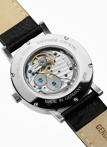 Диаметр стального корпуса 40 мм, толщина часов 8.9 мм. К достоинствам часов, несомненно, можно отнести сапфировые стёкла с двух сторон, стальные термически воронённые стрелки (как указывает производитель). Они всегда являются украшением часов. Декорированный механизм с синими болтами так же делает эти часы весьма привлекательными. И все было бы прекрасно, если бы не рекомендованная цена в 998 евро.