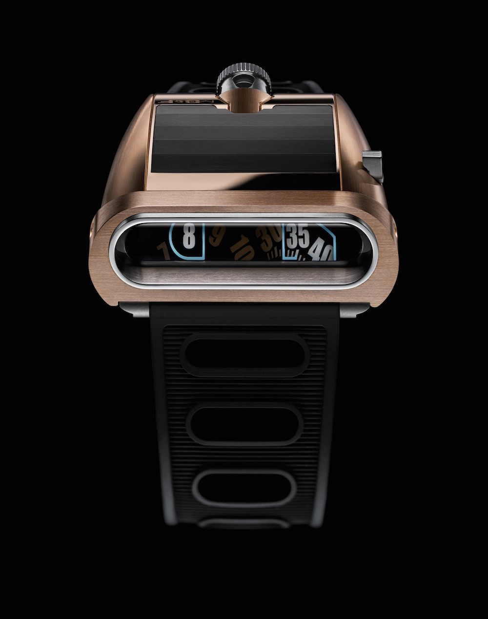 HM5 "RT", выпуск которых будет ограничен 66 экземплярами, сохранит все функциональные возможности Horological Machine No.5: автоматический механизм ручной отделки с двунаправленными «прыгающими» указателями часа; вертикальный способ отображения времени, отраженный и увеличенный оптической призмой из сапфирового стекла; и жалюзи «световые конвекторы», которые заряжают super-luminova диски часов и минут.
