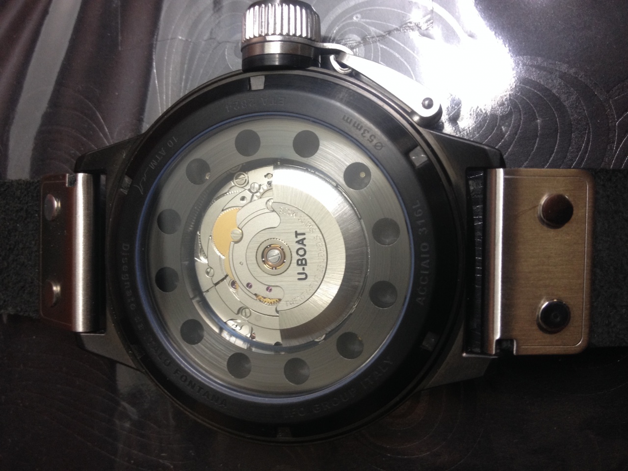 Например, на личном примере могу сказать, что в U-Boat Thousands of Feet в одной и той же модели, с одним и тем же Ref, я видел Unitas в трех разных версиях - от самой базовой без декорирования вообще, до топовой, с декорированием женевскими волнами и т.п. "почти как в Panerai", только без лебединой шеи. Так что даже внешний вид механизма в оригинальных U-boat в одной и той же модели может варьироваться и быть каким угодно, в зависимости от того, что производитель смог "добыть" в тот или иной момент.