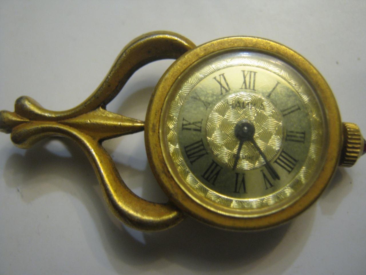 Не испытывайте иллюзий о цене этой вещи на ебей.20-30$. Камень не драгоценный, часы не позолоченные. Обычная винтажная вещица. Отсутствие информации о вещи подобного вида в интернете, не означает что она дорого стоит. Просто может она никому не нужна??? Как свои то Алина отреставрировала??? Перепокрыла их золотом, эмаль восстановила? Уверен что они скорее всего у неё даже у мастера нормального не обслуживались.
