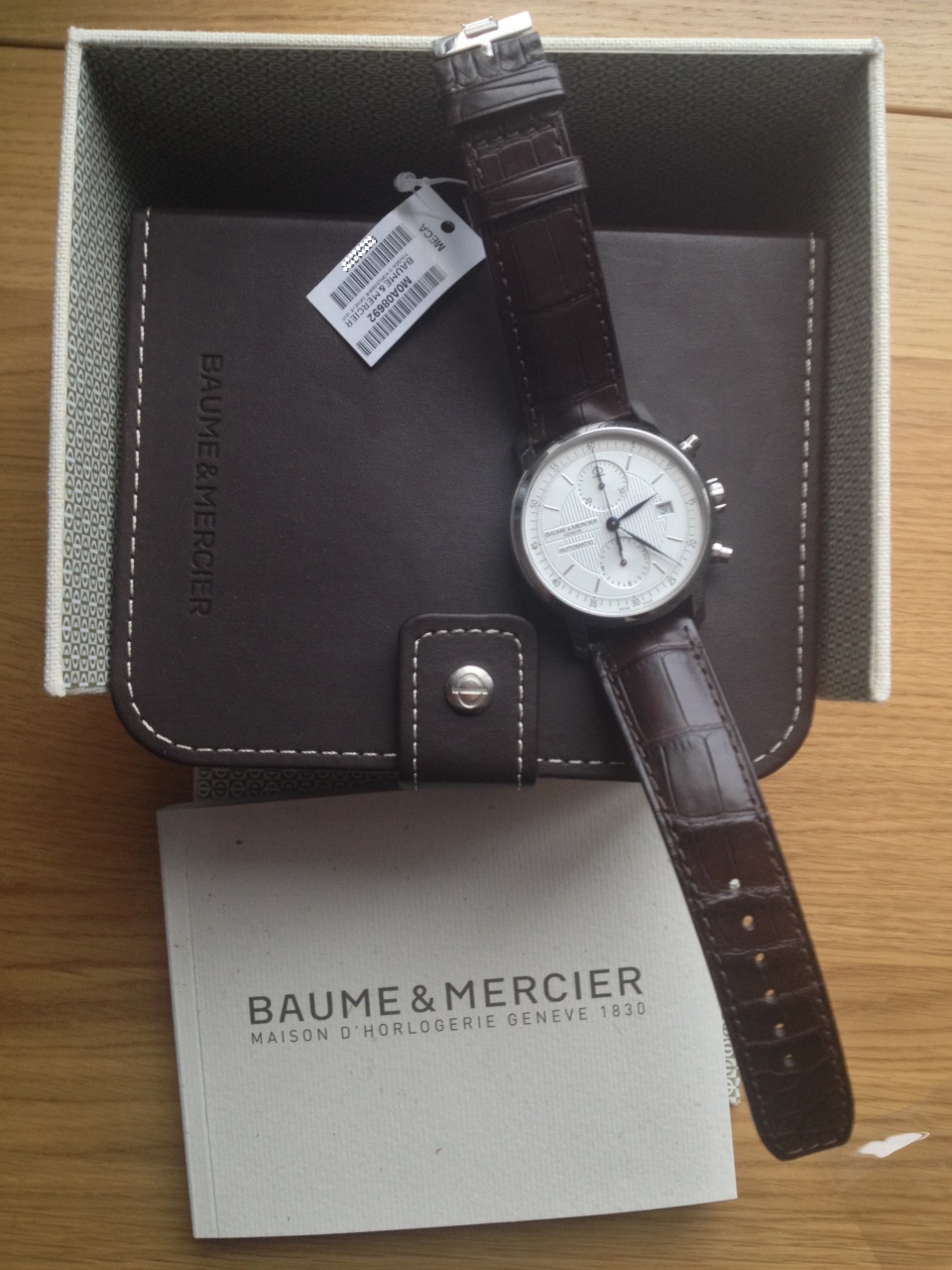 Пол: мужские Год покупки: 2013 Новые часы, состояние: N (новые в пленках) http://forum.watch.ru/images/market-question.png Цена: 70 000 руб. (продажа) Коробка: есть Документы: есть Классический мужской хронограф Baume & Mercier (MOA08692) Розничная цена в России - 124 тысячи рублей Диаметр 42 мм Высота 13,5 мм Механизм Valjoux 7750 Водонепроницаемость: 30 м Темно-коричневый ремень, застежка бабочка Гильошированный циферблат, вороненые стрелки Задняя крышка с гравировкой и прозрачным окошком Часы новые, в пленках, с полным комплектом Возможна доставка по России Вложение 599171 Вложение 599155 Вложение 599172 Вложение 599173 Вложение 599174 |