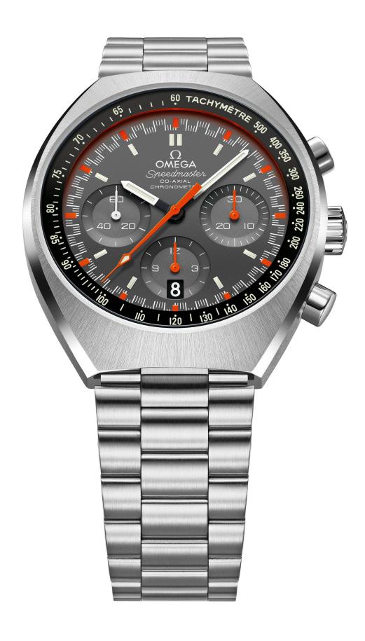Новинка имеет круглый корпус, изготовленный из нержавеющей стали, водонепроницаемый до 100 метров. На торце завинчивающейся защищенной рифленой заводной головки, расположенной на 3 часах, выгравировано изображение эмблемы бренда Omega. Пушеры хронографа - на 2 и 4 часах. На 10 часах - корректор указателя даты. Сапфировое стекло защищает матово-черный или серый циферблат с накладными прямоугольными часовыми индексами и стрелками белого или оранжевого цвета, покрытыми люминесцентным составом белого цвета. На фланце расположена круглая тахиметрическая шкала.