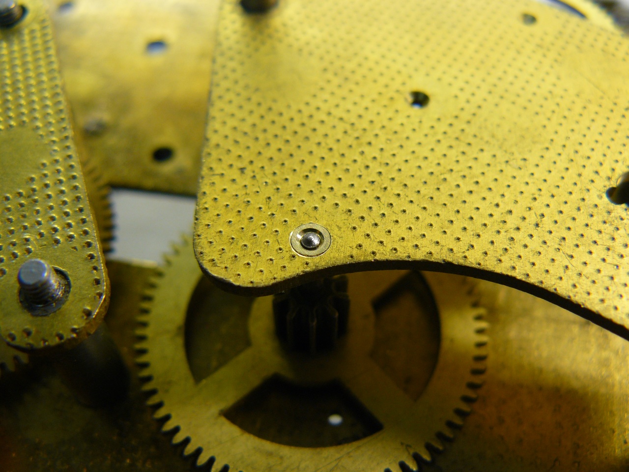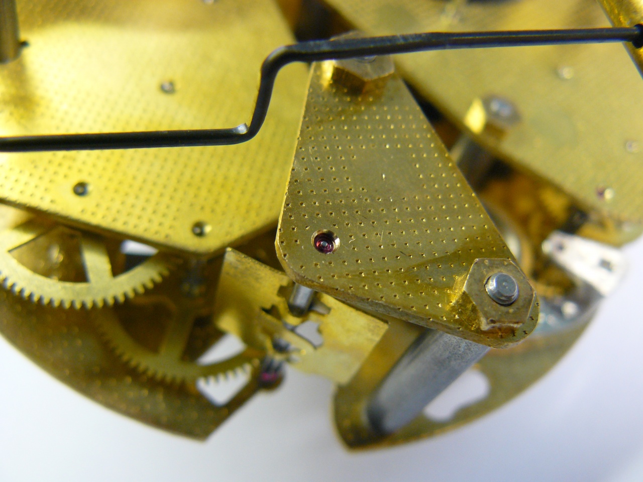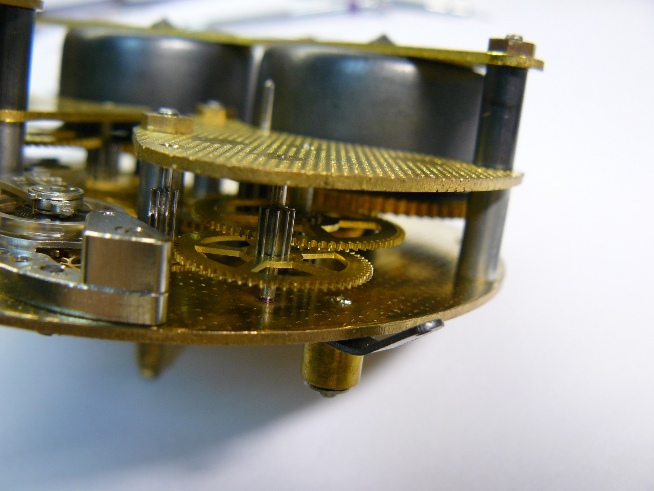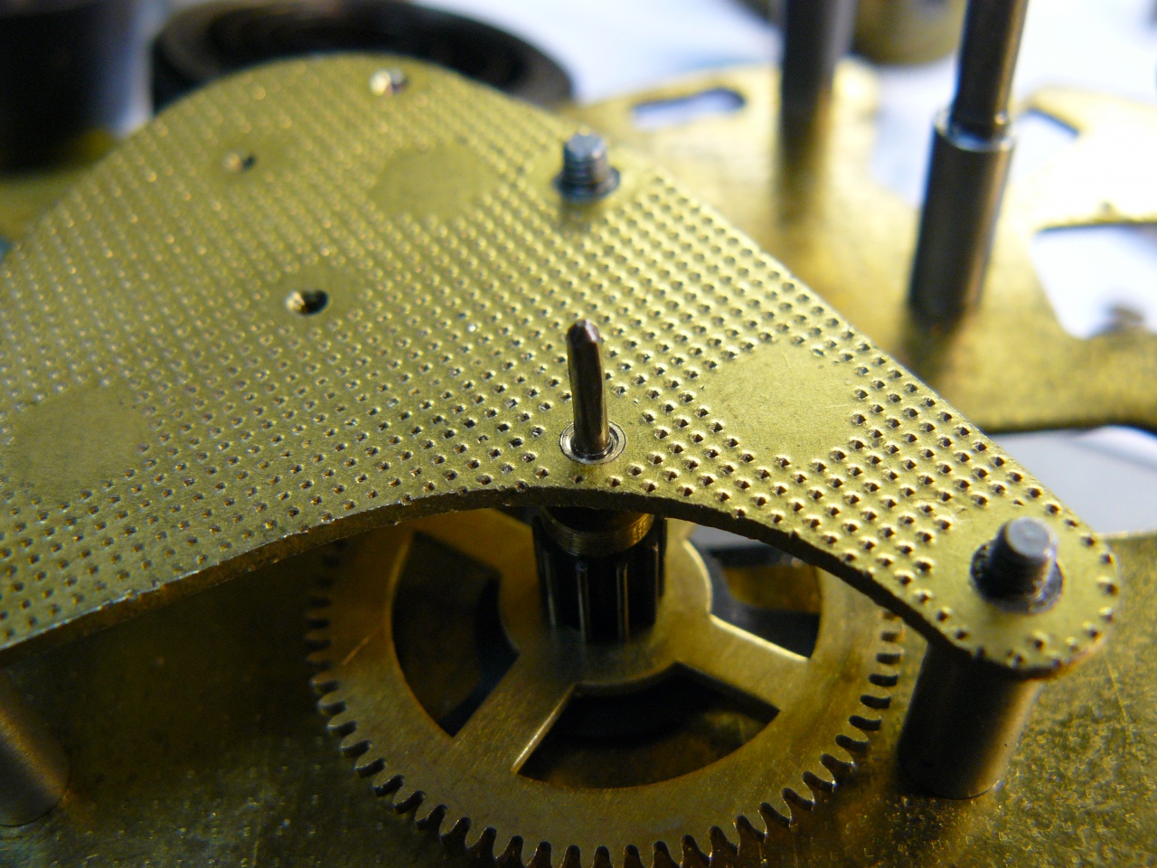 Часы перебирал для нашего форумчанина Дизайн часов эпохи 60-х, корпус висит на веревке Жаль, не удалось сделать фото внешнего вида "до", часы как будто побывали в роли игрушки, цифры были наведены шариковой ручкой, стрелки покрашены фиолетовым лаком для ногтей, кисточкой с разводами:( Изначально стрелки были покрыты покрытием под золото, но т.к. оно не сохранилось, решил покрасить их в черный цвет, так контрастнее Корпус после отмокания в стиральном порошке стал снова чистым, кстати я не знаю, были ли цифры покрыты краской, или нет Вложение 611549Вложение 611550Вложение 611551 Теперь самое интересное - механизм Калибр СЧЗ 100125 своей двухуровневой конструкцией напоминает один мех Ленцкирха Вложение 611553Вложение 611554Вложение 611555 Вложение 611561 На первый взгляд кажется, что в механизме 2 барабана, но это не так, черные барабаны - неподвижные и прикреплены к мосту, в общем Маяк верен традиции неподвижно закрепленных пружин Вложение 611562Вложение 611563 В механизме нашлось несколько изношенных цапф и отверстий Цапфы секундного колеса и соответствующие им отверстия - слабое место всех Маяков, поэтому слабое место было решено превратить в сильное, поставив камни Вложение 611564Вложение 611565Вложение 611566 Цапфы колеса были обточены под диаметр отверстия в камне и укорочены Вложение 611567Вложение 611568 Теперь вращается как по маслу :cool: Вложение 611571 Ось ветряка на удивление тоже имела сильный износ цапф, поэтому она тоже была "пересажена" на камни Вложение 611573 Также было установлено 3 футора под недельные колеса хода и боя и промежуточное колесо ангренажа Вложение 611578Вложение 611579Вложение 611580Вложение 611581 ------- ДОБАВЛЕНО ЧЕРЕЗ 15 МИН -------- Установка футора под промежуточное колесо: футор впрессован в платину, но диаметр отверстия несколько меньше диаметра цапфы: Вложение 611584 Далее берем сверло подходящего диаметра и рассверливаем футор под диаметр цапфы, используя противоположное отверстие в мосту как направляющую для сверла Вложение 611585Вложение 611586 Цапфа идеально подходит Вложение 611587 Теперь осталось сделать лунку для удержания масла Вложение 611588 Кинематика механизма хорошо видна на этом фото Вложение 611589 Механизи перебран, смазан, судя по маркировкам на приставном ходу, год выпуска - 1968 Вложение 611591 Вложение 611592Вложение 611593Вложение 611594 Вложение 611595Вложение 611596Вложение 611597 Вложение 611598Вложение 611599 Вместо потрепанной старой веревки была сплетена (с чужой помощью) новая Вложение 611600Вложение 611601 Вид сзади Вложение 611602 Установка дополнительных камней не прошла даром, механизм показал хорошую амплитуду баланса, которая достигала 300 градусов в рабочем положении (горизонтальная ось баланса) С регулировкой пришлось помучиться, часы сильно спешили (+4 мин/сутки) при среднем положении регулятора, штифты максимально сдвинуты, поэтому пришлось подложить по 5 грузовых шайб под 2 противоположных винта баланса |