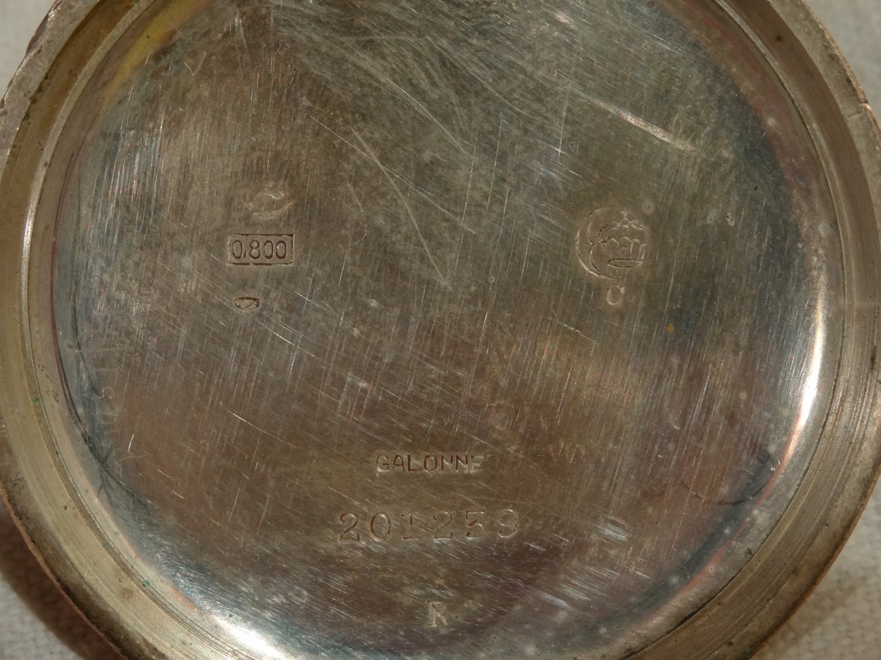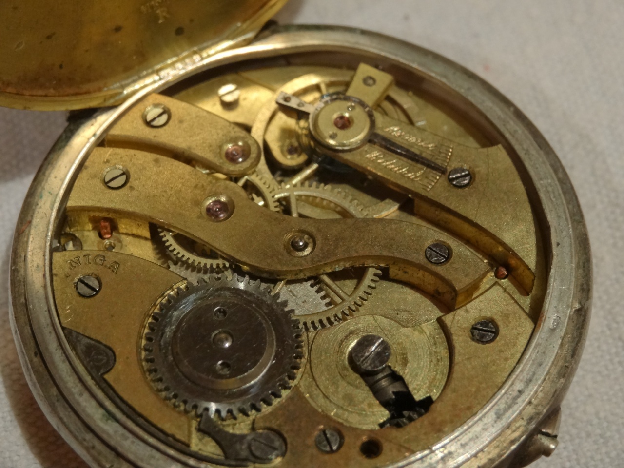 Помогите, пожалуйста, определить что это за часы. Когда и кем были произведены. Там из опознавательных знаков только корона с полумесяцем, проба - 0,800, надпись GALONNE (насколько я знаю это говорить о том что часы серебряные с позолотой). На самом механизме надпись NIGA, но ничего по этому поводу я найти не смогла. Есть еще номер, выбит на двух крышках. Спереди крышки не было. Одна из стрелок (минутная) не оригинальная. Вложение 624323