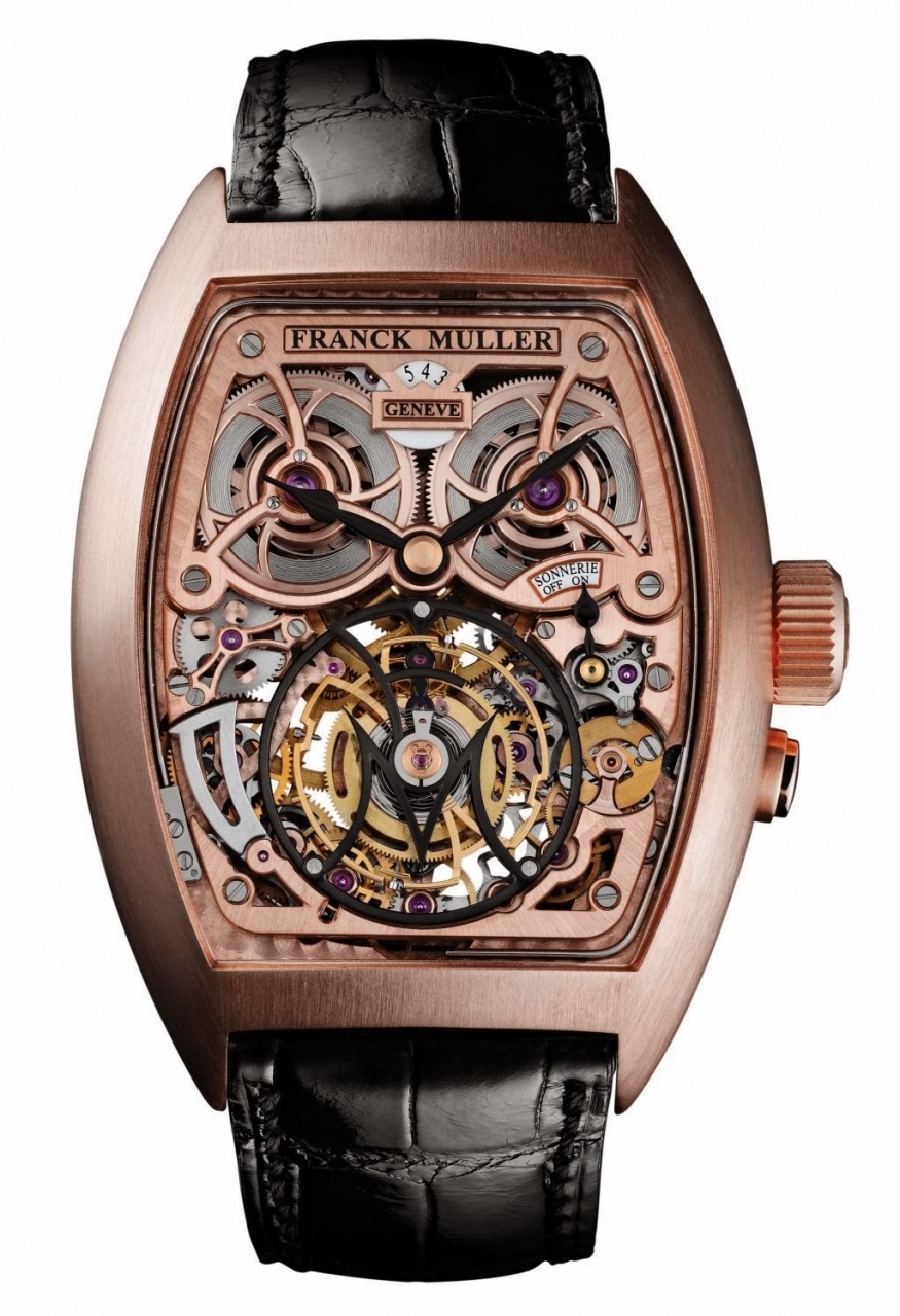 Новинка имеет классический фирменный корпус Cintrée Curvex (доступен также вариант модели с круглым корпусом), изготовленный из 18-каратного розового золота, длиной 59,20 мм, шириной 43,70 мм, толщиной 14,00 мм. На торце рифленой заводной головки, расположенной на 3 часах, выгравирован логотип бренда Frank Muller. На 4 часах имеется пушер включения/выключения гонга (соответствующий аналоговый указатель расположен на передней стороне калибра на 3 часах). Сапфировое стекло установлено на передней стороне корпуса и на его задней крышке. Циферблат, как таковой отсутствует. Модель оснащена сложным скелетонизированным мануфактурным швейцарским механизмом с ручным заводом, длиной 41,40 мм, шириной 34,40 мм, толщиной 8,50 мм, состоящим из 447 деталей, на 54 камнях, с балансовым колесом диаметром 16,70 мм и золотыми регулировочными винтами, балансовой частотой 18000 полуколебаний в час (2,5 гц), брегетированным волоском собственного производства, четырьмя последовательно установленными заводными барабанами, запасом хода 6 дней (без использования гонга) и 40 часов (при работающем гонге), функциями индикации часов, минут (посредством соответствующих центральных стрелок), секунд (посредством соответствующей стрелки, установленной на каретке турбийона), запаса хода (посредством соответствующего цифрового указателя в апертуре, расположенной на 12 часах), с прозвоном каждый час (с возможностью установки работы гонга через каждые полчаса). Турбийон расположен на 6 часах, его каретка на керамических шарикоподшипниках, диаметром 20,0 мм. Калибр отменно отделан и декорирован, в частности посредством ручной гравировки, родирования, циркулярного гранения, снятия фасок. Поставляется на черном ремешке из кожи аллигатора с застежкой из 18-каратного розового золота. Вложение 626611Вложение 626612 Источник: http://www.masterhorologer.com/2014/...ourbillon.html |