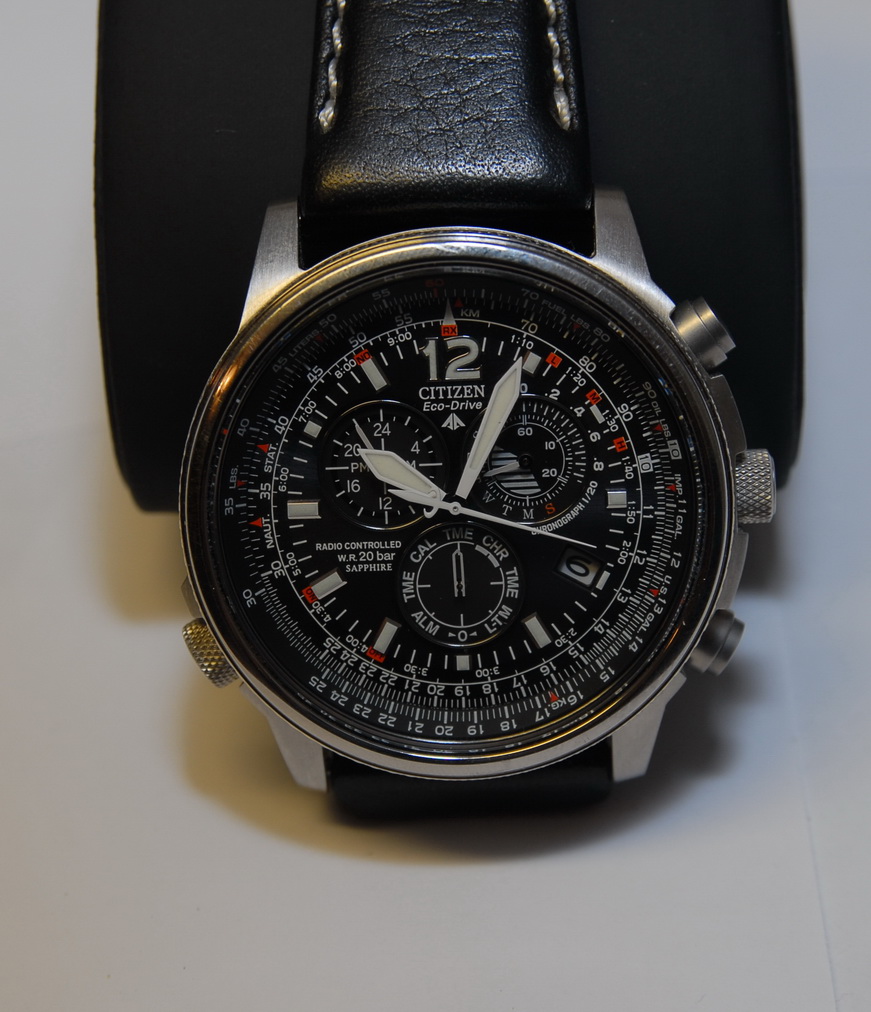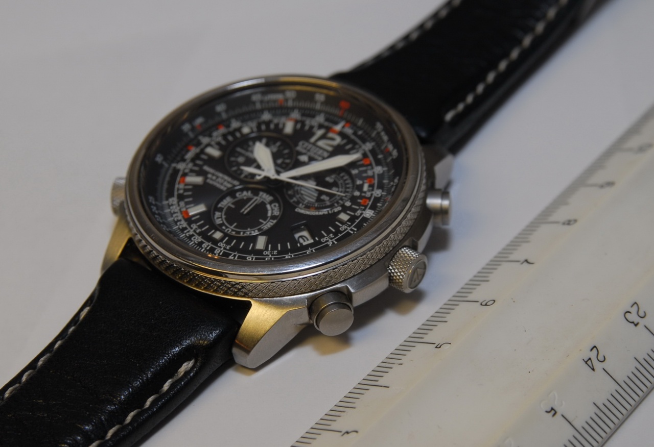 Могу сразу сказать что за это время часы ничуть не разочаровали меня, даже наоборот стали нравиться еще больше... За это время они неоднократно вынужденно проходили "тесты на живучесть" и все их отлично выдержали, так-что со своей задачей - быть надежными, функциональными и точными часами в любой ситуации - они отлично справляются:cool: Продавались часы в массивной и жесткой прямоугольной коробке, судя по весу металлической, хотя не уверен. В комплекте идет мировая гарантия, толстенькая книжка инструкции на разных языках (русского нету) и еще какие-то бумажки. Русскую инструкцию дали распечатанную на 4-х листочках А4:cool: Вложение 19491 Модель полностью стальная на очень толстом кожаном ремешке с хорошей стальной защелкой, хотя аналогичные модели есть и на браслете. Но браслеты у них какие-то слишком... грубые что ли, да и смотрятся они на ремешке имхо интереснее. Также бывают титановые модели, как на ремешке, так и на браслете, хотя имхо - сталь в данном случае уместнее - весит не больше (это для моделей с ремешком, у моделей с браслетом разница уже ощутима), а царапается меньше. Вложение 19492 Корпус часов состоит как-бы из двух частей - нижняя матовая и ровная, а верхняя полированная до зеркального блеска и при этом с крупной насечкой. Безеля на часах нету, так-что диаметр стекла (которое кстати сапфировое и с очень хорошим покрытием - словить им блик почти нереально) почти совпадает с размерами корпуса. Часы не маленькие (44 мм диаметр корпуса без кнопок, головок и ушек) и довольно толстые - около 14 мм, хотя возможно это мне кажется после моих Касио и Скагена. Вес на удивление небольшой для столь крупных часов. Вложение 19500 Вот несколько фотографий для оценки размера со Скагеном и Касио. Вложение 19501Вложение 19502Вложение 19504 В часах установлен Eco-drive калибр Е67*, с радиосинхронизацией точного времени (в России не особо актуально, хотя мне на удивление удалось поймать в Москве немецкий сигнал) и всеми стандартными функциями - хронографом (точность измерений 1/20 секунды), будильником (сигнал довольно тихий, утром разбудить не сможет, но вот напомнить о чем-либо когда уже не спишь вполне способен), вторым часовым поясом (удобно регулируется отдельно от основного времени перестановкой целых часов, т.е. нет мороки с выставлением минут), вечным календарем и т.д. Без инструкции я даже время выставить сам не сумел, но после ее прочтения все стало довольно понятно:D. Описывать работу с данным калибром не буду, скажу лишь что после нескольких раз любая функция вызывается легко а управление кажется весьма логичным (нелогична только индикация месяцев, почему-то начинающаяся с декабря:confused:). Часы относятся к серии Promaster SKY, которая якобы ориентирована для летчиков. Уж не знаю какие часы носят пилоты, но из "авиационных" функций в этой серии только логарифмическая линейка, для вращения которой предназначена отдельная головка напротив 7-часовой метки. Выглядит интересно, хотя сам я так и не понял как ею (линейкой) пользоваться:D Вложение 19498Вложение 19499 На задней крышке глубоко выгравирован эмблемы Eco-Drive и Promaster, и значительно слабее, практически незаметно, надпись что часы нельзя вскрывать вне сервиса. Вложение 19496 В темноте часы ярко светятся бирюзовым, при этом свечение сохраняется очень долго - вполне хватает с вечера до утра. Вложение 19495 Фото на руке к сожалению сделать 
