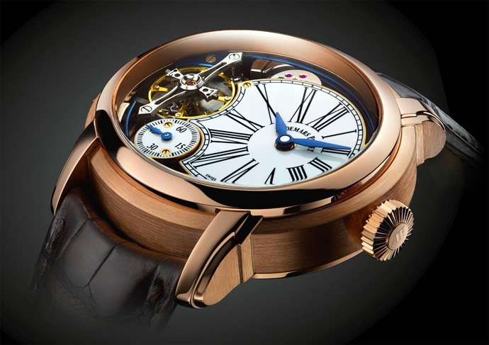 Millenary с минутным репетиром в корпусе из розового золота - это наручные часы с ручным подзаводом, овальным корпусом, трехмерной структурой и сложным механизмом со спусковым устройством собственной разработки Audemars Piguet с двумя волосковыми пружинами, молоточками и гонгами. Система завода механизма репетира была разработана специально для этих часов – рычаг завода репетира находится, как обычно, на отметке «9 часов», а барабан ударного механизма – на отметке «2 часа». Дизайн корпуса и эмалированные малые циферблаты притягивают взгляд к находящемуся внутри уникальному механизму со спусковым устройством собственной конструкции Audemars Piguet. За его основу принята разработка французского часового мастера XVIII века Робера Робина; в спуске сочетаются высокая эффективность прямого импульса и надежность традиционного швейцарского непрямого при отсутствии необходимости смазки палеты. Еще одно достоинство спуска AP – наличие не одной, а двух волосковых пружин : одна размещена над другой и развернута на 180°. Система плоских волосковых пружин, расположенных в противоположных направлениях, позволяет компенсировать возможные отклонения баланса и избавляет от необходимости «загибать» их концы. Благодаря наличию двух волосковых пружин системы прямого импульса для передачи энергии на колесо баланса сокращается количество помех, а следовательно, повышается эффективность и точность работы механизма. Овальный корпус Millenary из полированного розового золота и безель из сатинированного розового золота обрамляют скелетонизированный циферблат, подчеркивая отшлифованные вручную кромки, внутренние углы, а также общий антрацитовый тон, полученный в результате гальванической обработки. Следует также отметить видимый сверху изогнутый вдоль линии корпуса «вороненый» гонг минутного репетира. Вложение 634724 Источник: http://watchyourtime.net/haute-horlo...-repeater.html |