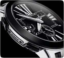 С первого взгляда становится ясно, что Executive Dual Time отличается от других моделей Dual Time Collection. В первую очередь своим дизайном: никогда прежде часы Ulysse Nardin не были столь тонкими, внешне простыми, но в тоже время оригинальными и элегантными. Дерзкий дизайн часов запоминается сразу: черный циферблат рассечен большими римскими цифрами и декорирован уникальными трехгранными стрелками. Маленькая секундная стрелка на дополнительном циферблате (в положении «6 часов») и большой указатель даты (в положении «2 часа») остаются традиционными для коллекции Dual Time. Элегантные кнопки переключения часового пояса, расположенные на корпусе в положении «8 часов» и «10 часов», выполнены из керамики. При нажатии кнопок часовая стрелка меняет положение, а указатель домашнего времени (на отметке "9 часов") продолжает свой 24-часовой цикл. Тогда как большая часть новинок Базеля появится в России к осенне-зимнему сезону, часы Executive Dual Time совсем скоро можно будет найти в лучших часовых магазинах нашей страны. Выполнены часы в двух вариантах: из нержавеющей стали и 18-каратного розового золота. Оба варианта дополнены керамическим безелем и кнопками переключения часового пояса на новом корпусе диаметром 43 мм. Ремешок также доступен в двух вариантах - из кожи аллигатора или каучуковый. Прозрачная задняя крышка позволяет видеть впечатляющий механизм с автоподзаводом. Каждый корпус диаметром 43 мм имеет свой индивидуальный номер. Черную заводную головку украшает якорь - исторический символ легендарной часовой мануфактуры. Вложение 23206 Вложение 23207 Источник: http://style.rbc.ru/luxury/2009/08/13/91612.shtml |