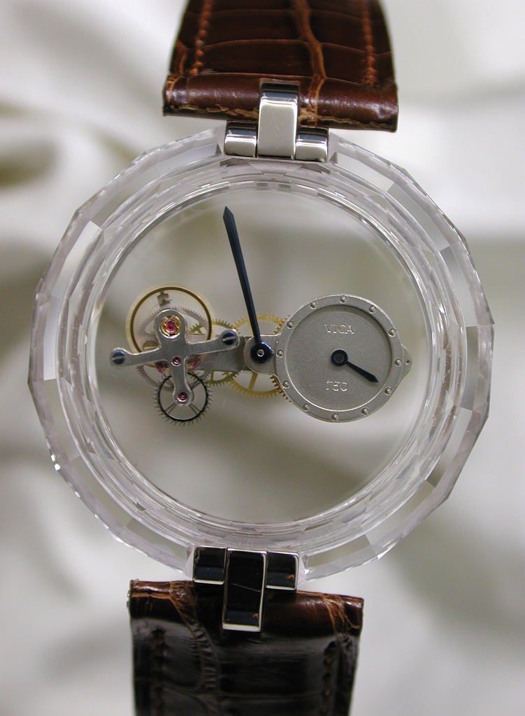 Корпус новинки изготовлен из белого сапфира, диаметром 36,0 мм, водонепроницаемый до 30 метров. Заводная головка расположена на задней стороне корпуса. Циферблат, как таковой, отсутствует. Калибр и стрелки свободно просматриваются сквозь корпус. Модель оснащена мануфактурным швейцарским механизмом с ручным заводом Vincent Calabrese, выполненный в 18-каратном белом или желтом золоте, на 19 камнях, с балансовой частотой 21600 полуколебаний в час (3 гц), 38-часовым запасом хода, с функциями индикации часов (посредством соответствующей центральной стрелки мечевидной формы) и минут (на малом боковом циферблате, расположенном на 3 часах), а также с турбийоном, каретка которого расположена под малым боковым циферблатом.