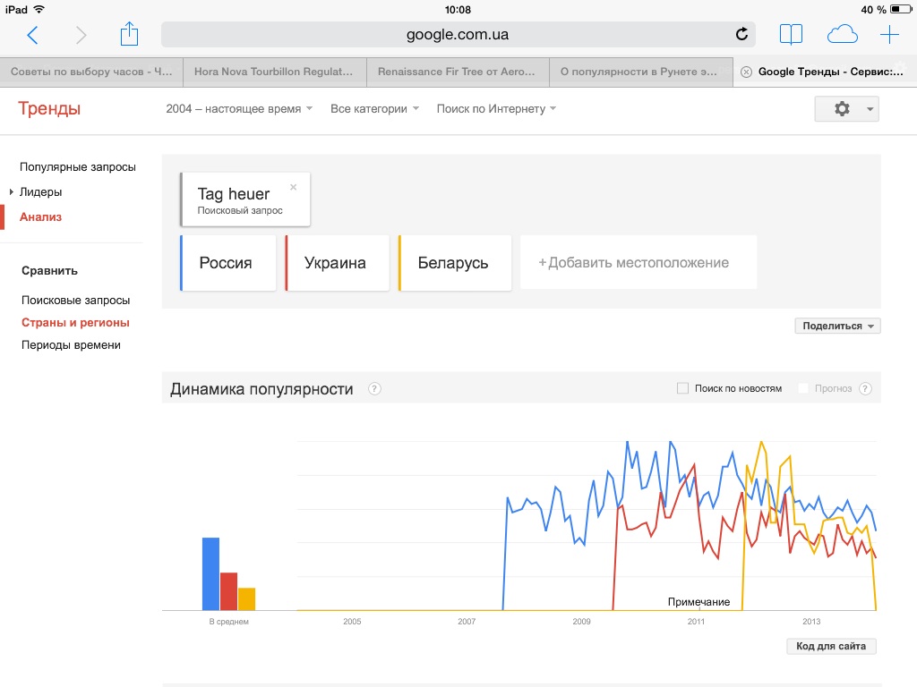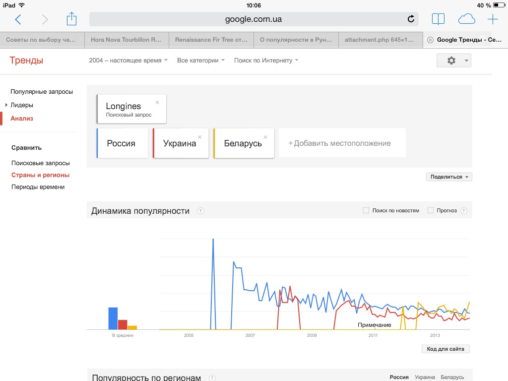 Понятно, что анализ дело тонкое и приблизительное, но тем не менее есть очевидные положения вещей. Для доп.доказательств можно зайти на всем доступный (самый популярный поисковик в мире - #1) Google и провести самостоятельно анализ. Думаю, что целевая аудитория обоих поисковых систем гугл или яндекс в России примерно равна. Вложение 644652 При анализе некоторых брендов сразу видно, что Ролекс гораздо популярнее тага, а Едокс менее популярен, чем Лонжин. Вложение 644653 Добавив Тиссо видим, что даже в мире Тиссо на уровне или слегка опережает Таг. А у нас в постсоветских странах Тиссо еще популярнее, скорее всего из-за массовости и как следствие доступности. Далее дополнительный анализ запросов в наших странах: Вложение 644654Вложение 644655Вложение 644656Вложение 644657Вложение 644658Вложение 644659 |