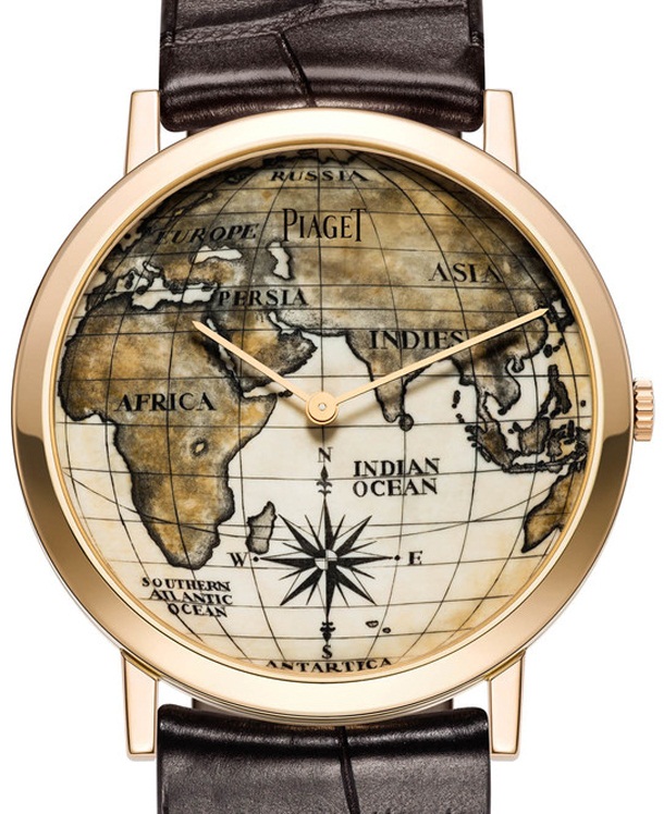 Часы Piaget Altiplano Scrimshaw необычны тем, что их циферблат изготовлен из окаменелого бивня мамонта. На циферблате изображена карта Восточного полушария. На изготовление одного циферблата мастеру потребовалось 65 часов. Эти часы являются маленькими уникальными шедеврами изобразительного искусства.