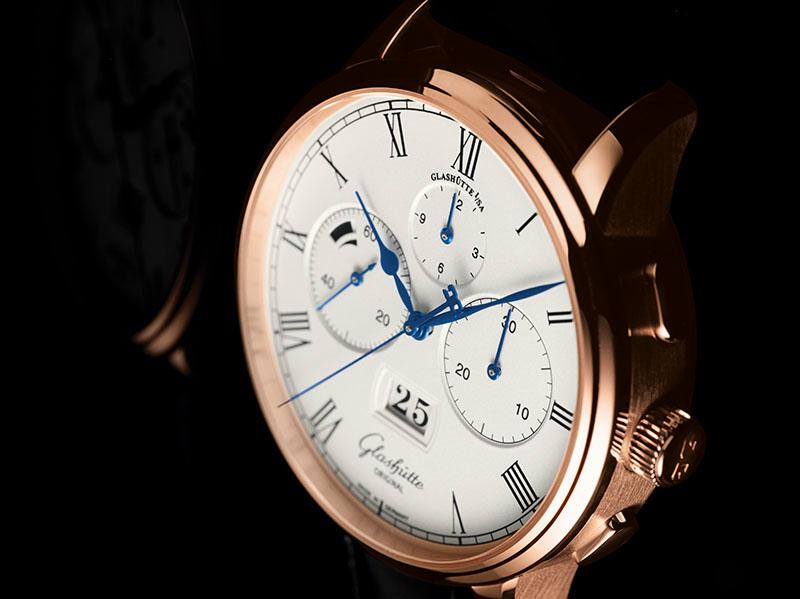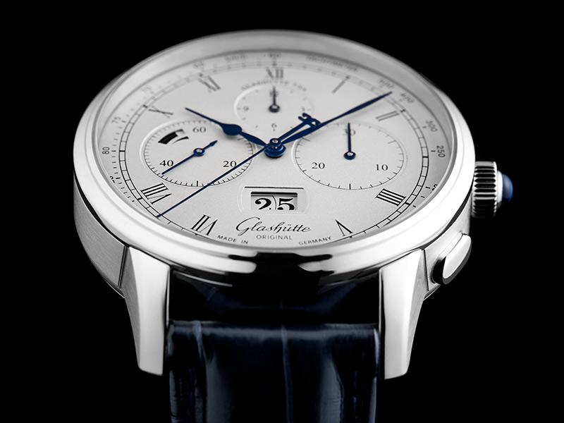 Дизайн новинки выполнен в элегантном классическом стиле. Полированный круглый корпус, диаметром 42,0 мм, толщиной 14 мм, водонепроницаемый до 50 метров. На торце рифленой защищенной заводной головки, расположенной на 3 часах, выгравирован логотип бренда Glashütte Original (у золотого варианта модели) или установлен синий сапфировый кабошон (у платинового варианта модели). Пушеры хронографа размещены на 2 и 4 часах. Сапфировое стекло установлено на передней стороне часового корпуса (с двусторонним антибликовым покрытием) и на его задней крышке. Циферблат с черными напечатанными римскими цифрами и с воронеными стрелками.