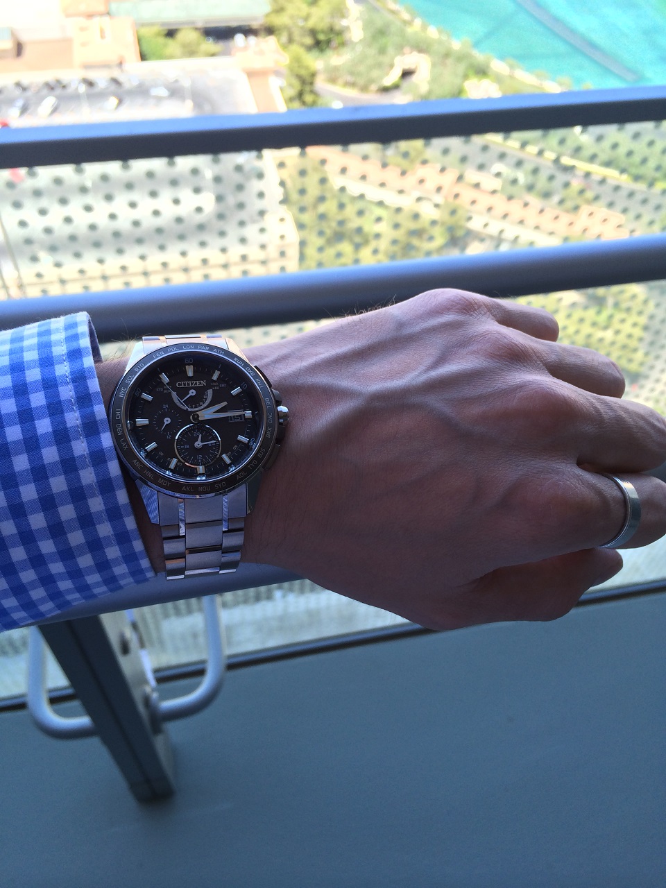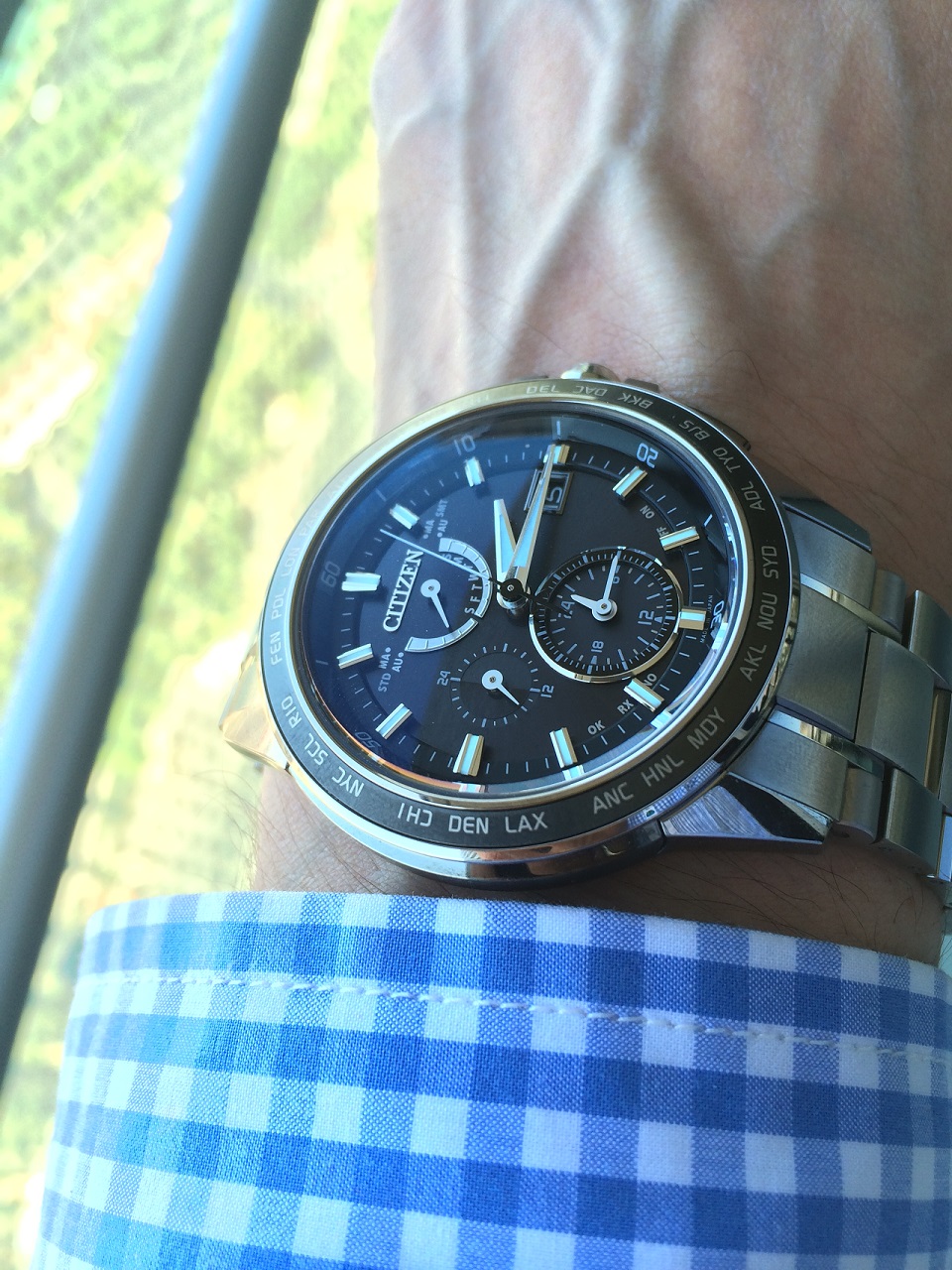 Искал часы с world/dual time, черным цифером на серебристом браслете и небольшим весом, приглянулись Citizen AT9024-58E.