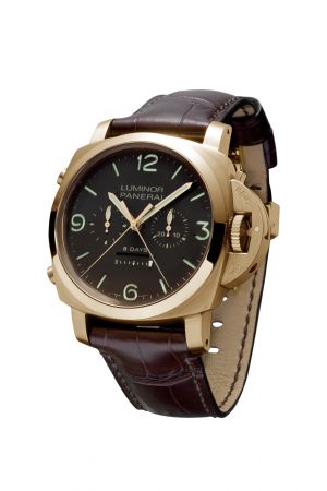 Часовая марка Officine Panerai представил новый сплит-хронограф Luminor 1950 8 Days Rattrapante Pink Gold 47 mm уникальным механизмом Manifattura P.2006, выпущенный лимитированной серией 300 экземпляров.