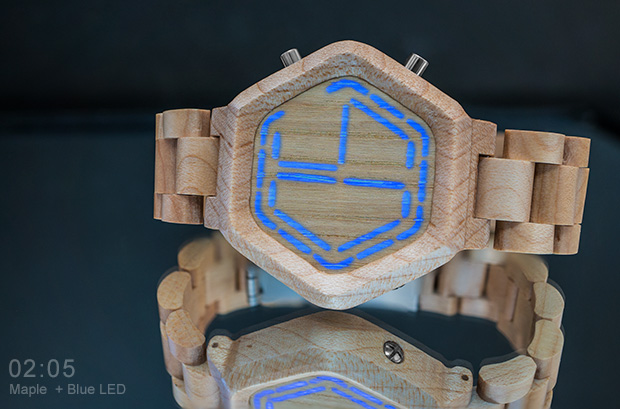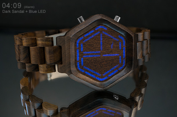 Японская фирма Tokyoflash славится своими разнообразными часами причудливой формы со сложночитаемым временем. На этот раз разработчики отошли от традиционной концепции сломать мозг пользователю и создали часы Kisai Night Vision Wood с простой для понимания индикацией и корпусом из дерева. Часы имеют шестиугольную форму, а LED-индикаторы спрятаны под слоем дерева и загораются при нажатии на кнопку.