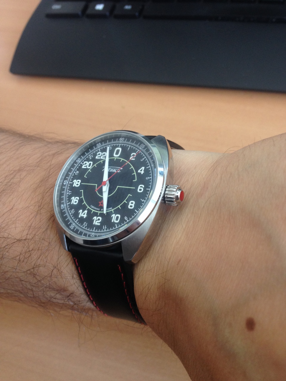 Очень нравится точность: завожу каждый вечер, и по секундомеру айфона погрешность 3,1-3,25 секунды в сутки стабильно, хотя ронял и бил о дверные косяки их уже не раз. :) Ношу обычно на даче и в командировках. Промежуточные часы читаются неудобно, но я привык. Самая большая претензия к люминофору - в темноте нихрена не видно уже минут через 10-20, даже если весь день на свету лежали. Очень жду модель с автоматом. |