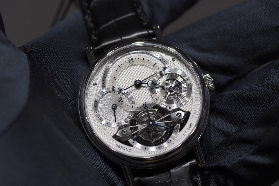 Classique Tourbillon Perpetual Calendar (Ref. 3797) от Breguet Вложений: 2 Новая модель Classique Tourbillon Perpetual Calendar от одного из грандов швейцарского часпрома Breguet была впервые официально представлена на крупнейшей в мире часовой выставке Baselworld- 2014, которая завершилась в апреле текущего года. Дизайн новинки выполнен в элегантном классическом стиле. Круглый полированный корпус изготовленный из платины 950-ой пробы (Ref. 3797PT/1E/9WU) или из 18-каратного розового золота (Ref. 3797BR/1E/9WU), диаметром 41,0 мм, водонепроницаемый до 30 метров. Рифленая заводная головка расположена на 3 часах. Сапфировое стекло установлено на передней стороне корпуса и на его задней крышке. Циферблат гильошированный, серебристого цвета. Стрелки вороненые, в том числе часовая и минутная с фирменными "яблоками Бреге". Модель оснащена мануфактурным швейцарским механизмом с ручным заводом Breguet 558QP2, отрегулированным в шести положениях, на 21 камне, с балансовой частотой 18000 полуколебаний в час (2,5 гц), 50-часовым запасом хода, функциями индикации часов, минут (посредством соответствующих центральных стрелок), секунд (посредством тройной секундной стрелки, расположенной на каретке турбийона), даты (посредством ретроградного аналогового указателя, расположенного на 12 часах), дня недели (посредством соответствующего круглого аналогового указателя, расположенного на 9 часах), месяца и високосного года (посредством соответствующих стрелок на круглом аналоговом указателе, расположенном на 3 часах), а также с минутным турбийоном, каретка которого размещена в крупной апертуре неправильной формы, расположенной на 6 часах. Калибр отлично отделан и декорирован. Поставляется на черном ремешкме из кожи аллигатора с платиновой тройной раскладной застежкой или на коричневом ремешке из кожи аллигатора с застежкой из 18-каратного розового золота. Вложение 712764 Источник: http://professionalwatches.com/2014/...3797.html#more |