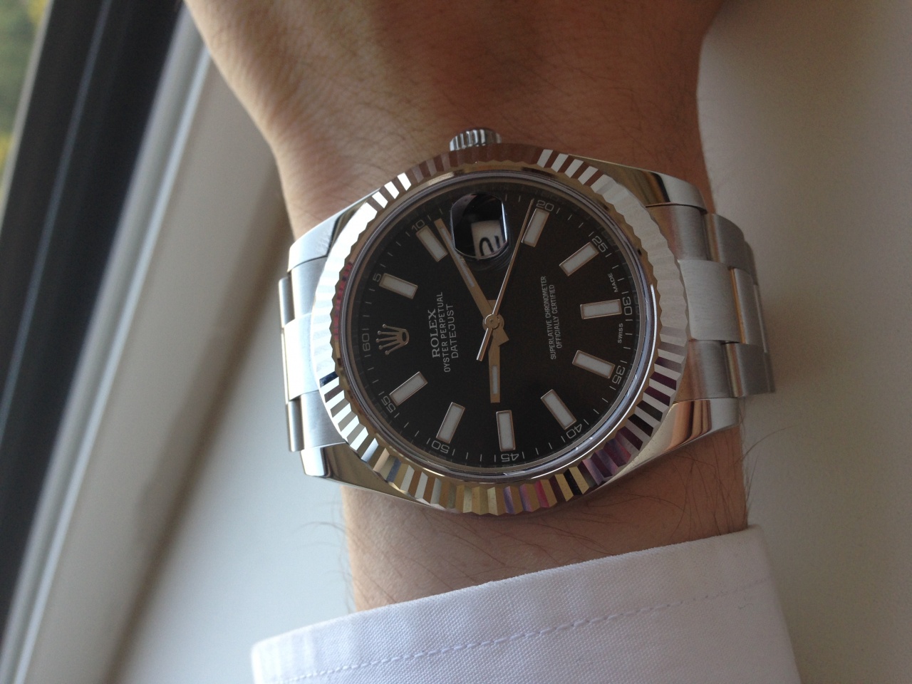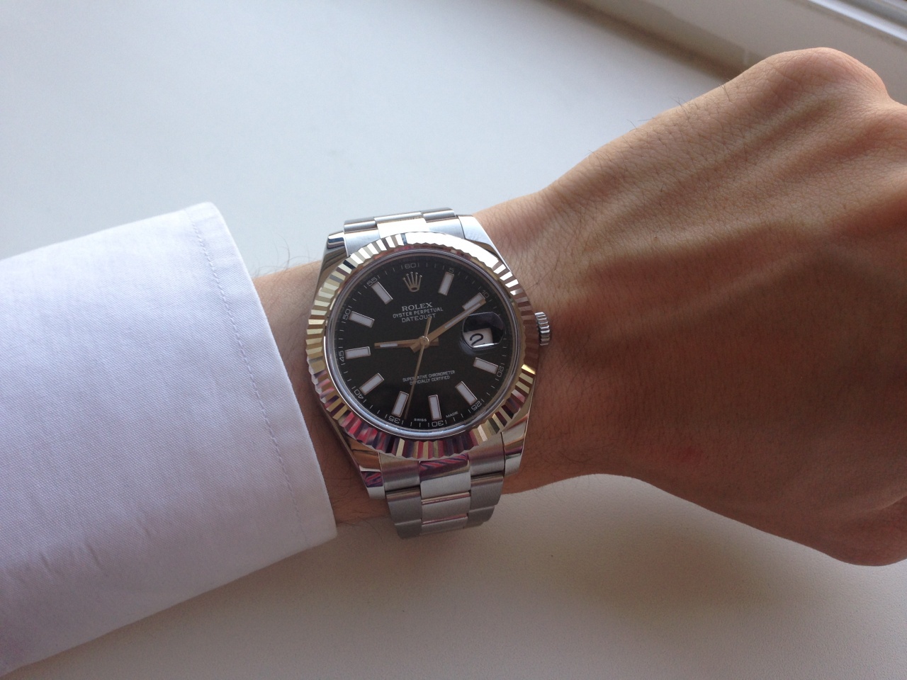 Признаюсь честно, ролекс особо никогда не любил. Ну не цепляет и все тут. Да и на браслетах часы никогда не носил. Неудобно. Но под натиском форума немного пересмотрел свое отношение к марке. Сходил в меркюри, померил несколько ролексов, глазками все посмотрел. Ну что я могу сказать - в целом мое отношение изменилось несильно. Но пара моделей зацепила. Одна из них - биколорный суб (синий с золотом). Но суб станет героем моей следующей темы в ролексовской ветке, а пока что я приобрел дейтджаст - вторую модель ролексов, которая мне сильно понравилась.