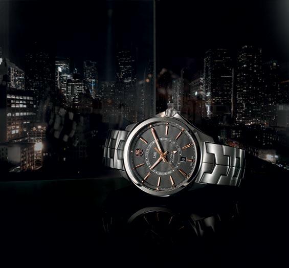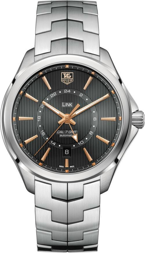 Новая модель Link Calibre 7 GMT от швейцарской часовой компании TAG Heuer имеет круглый корпус, изготовленный из нержавеющей стали, диаметром 42,0 мм, водонепроницаемый до 100 метров. На торце защищенной завинчивающейся рифленой заводной головки, расположенной на 3 часах, выгравирована эмблема бренда TAG Heuer. Сапфировое стекло установлено на передней стороне часового корпуса (с антибликовым покрытием) и на его завинчивающейся задней крышке. Циферблат цвета антрацит, гильошированный вертикальными полосками, с накладными золотистыми часовыми индексами и стрелками. Часовая, минутная и GMT стрелки покрыты люминесцентным составом SuperLuminova белого цвета.