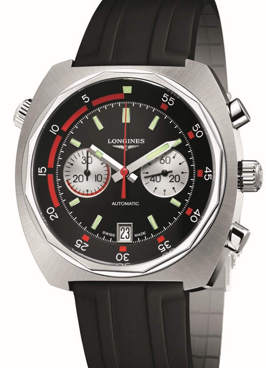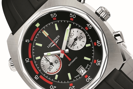 Подушкообразный сатинированный корпус новинки изготовлен из нержавеющей стали, диаметром 43,0 мм, водонепроницаемый до 300 метров. На торце завинчивающейся рифленой заводной головки, расположенной на 3 часах, выгравирована эмблема бренда LONGINES. На 2 и 4 часах размещены пушеры хронографа, на 10 часах - головка управления внутреннего вращающегося двунаправленного кольца с дайверской разметкой, расположенного на периферии циферблата. Сапфировое стекло с антибликовым покрытием защищает циферблат матово-черного цвета с накладными часовыми индексами, покрытыми, как и родированные часовая и минутная стрелки, люминесцентным составом SuperLumiNova белого цвета. Модель оснащена швейцарским автоматическим механизмом LONGINES L651.3 (базовый калибр ETA 2894-2), на 37 камнях, с балансовой частотой 28800 полуколебаний в час (4 гц), 42-часовым запасом хода, функциями индикации часов, минут (посредством соответствующих центральных стрелок), секунд (на малом боковом циферблате, расположенном на 3 часах), даты (посредством соответствующего цифрового указателя в апертуре, расположенной на 6 часах), а также с хронографом (центральная секундная стрелка красного цвета и 30-минутный счетчик, расположенный на 9 часах). Поставляется на черном каучуковом ремешке с застежкой из нержавеющей стали. Вложение 726647Вложение 726648 Источник: http://www.leblogdesmontres.fr/2014/...r-chronograph/ |