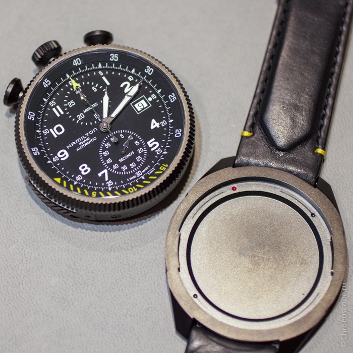 Khaki Takeoff — это часы двойного назначения: они могут быть как настольными, так и наручными. Их продают в подарочной коробке, которая стилизована под приборную панель самолета. Хронограф установлен в центре панели — он ввинчен в специальное гнездо с названием модели. Если же владелец захочет надеть часы на руку, то ему надо будет вывернуть корпус из панели и пересадить «шайбу» на ремешок с креплением для нее. Корупс сделан из стали с черным PVD-покрытием. Его диаметр составляет 46,3 мм. Khaki Takeoff — это буллхед, кнопки хронографа и массивная заводная головка находятся у отметки «12 часов», а не на «3 часах» как обычно. Безель декорирован рифлением. Он вращается в две стороны и используется для управления внутренней шкалой обратного отсчета. Шкала получила яркую желтую расцветку — в тон наконечнику стрелки хронографа и прострочке ремешка. Индексы сделаным белыми и отлично читаются на черном циферблате. Они покрыты люминесцентным составом. В часах установлен автоматический механизм H-31 с 60-часовым запасом хода. Этот калибр создан ETA специально для нужд Hamilton и активно используется в других сериях. Модель выпущена сравнительно небольшим тиражом в 1999 экзепмляров (каждые часы пронумерованы). Цена: $ 3295. Вложение 730054Вложение 730055Вложение 730056Вложение 730057 Источник: http://chronoscope.ru/2014/06/hamilt...f-auto-chrono/ |