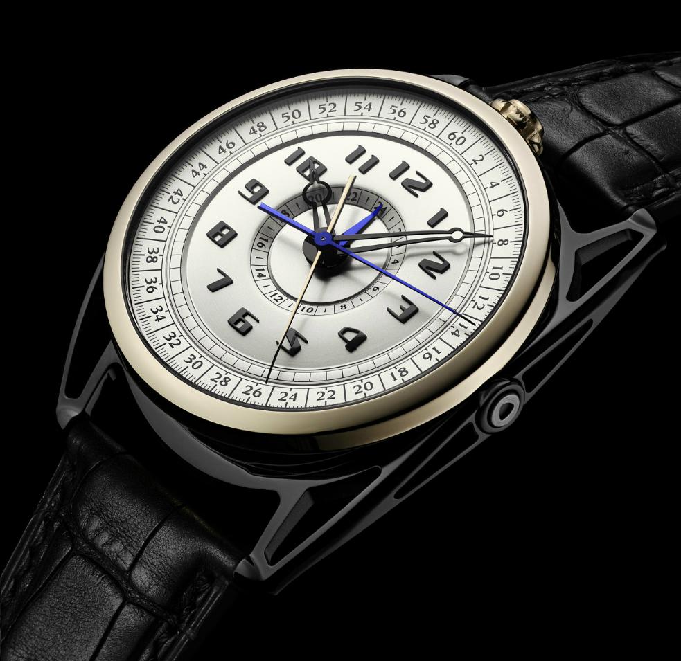 Новая модель DB28 Maxicrono от швейцарской часовой компании De Bethune имеет круглый полированный корпус, изготовленный из 18-каратного розового золота, диаметром 45,0 мм, толщиной 11,0 мм. Плавающие ажурные полированные ушки из циркония с черным покрытием. Заводная головка, функционирующая также в качестве монопушера хронографа. Сапфировое стекло установлено на передней стороне часового корпуса (с двусторонним антибликовым покрытием) и на его завинчивающейся задней крышке. Циферблат серебристого цвета, выполнен на разных уровнях. От центра к периферии расположены круглые шкалы: 24-часового счетчика хронографа, часовая (с черными накладными арабскими цифрами), минутная и секундная. Часовая и минутная стрелки скелетонизированные, выполнены из нержавеющей стали с черным покрытием; хронографические часовая и секундная стрелки - вороненые, а минутная - изготовлена из розового золота.