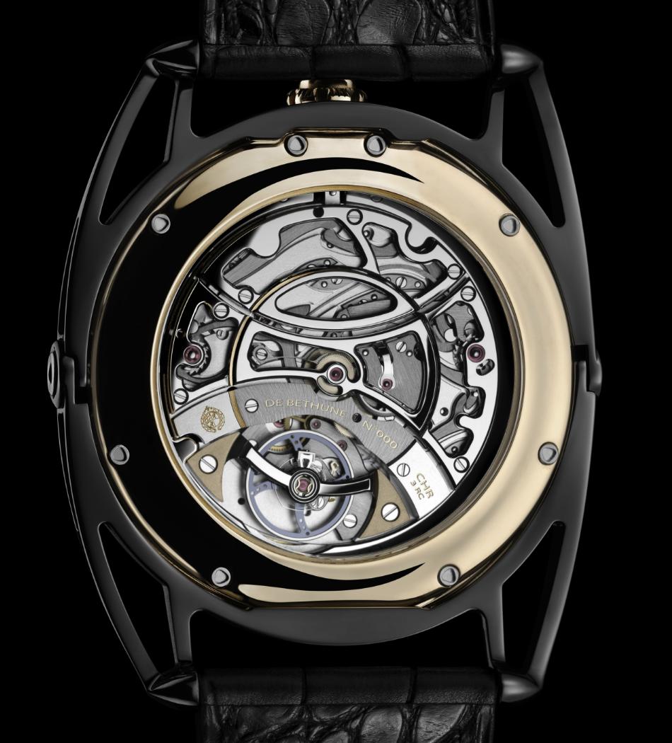 Модель оснащена мануфактурным швейцарским механизмом с ручным заводом De Bethune DB2030, с вручную полированными мостами из розового золота и нержавеющей стали, 5-дневным запасом хода, функциями индикации часов, минут, а также с хронографом с 24-часовым, 60-минутным и 60-секундным счетчиками. Калибр отлично отделан и декорирован.