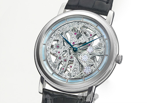 В честь 40-летия выпуска своей престижной линейки Credor (1974), японская часовая компания Seiko выпустила лимитированную модель Credor 40th Anniversary Signo Cherry Blossoms Skeleton (GBBD965). Новинка отличается, как это и явствует из ее названия, скелетонизированным калибром, вручную гравированном со стилизованным изображениием цветущей сакуры ("Cherry Blossoms" - "цветущая вишня"). Гравирование модели осуществлял мастер-гравер компании Seiko Kiyoshi Terui.
