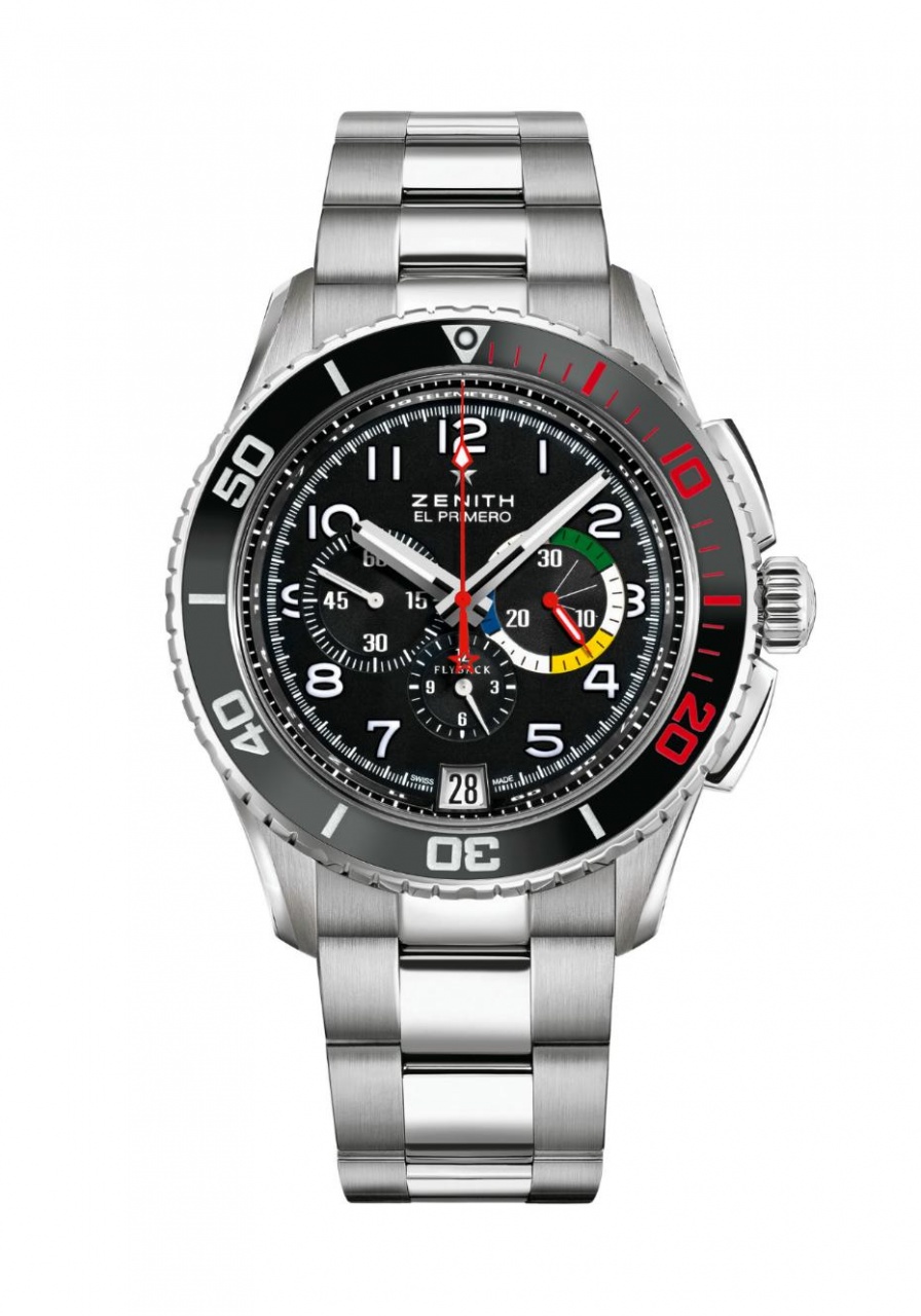 Круглый корпус новинки изготовлен из нержавеющей стали, диаметром 45,5 мм, толщиной до 14,1 мм, водонепроницаемый до 100 метров. На торце завинчивающейся рифленой заводной головки, расположенной на 3 часах, выгравирована эмблема бренда Zenith. Пушеры хронографа, прямоугольной формы, размещены на 2 и 4 часах. Безель зубчатый, однонаправленный, изготовленный из алюминия, с черным покрытием. Сапфировое стекло установлено на лицевой стороне корпуса (выпуклое, с двусторонним антибликовым покрытием) и на его задней крышке. Циферблат, диаметром 35,0 мм, матово-черного цвета, с арабскими цифрами и стрелками с люминесцентным покрытием Superluminova белого цвета. На фланце расположена круглая телеметрическая шкала. Обращает на себя расцветка 30-минутного счетчика, обеспечивающая отличное считывание показателей в ночное время в кабинах самолетов с инфракрасным освещением. Модель оснащена мануфактурным швейцарским автоматическим механизмом El Primero 405B, диаметром 30 мм, толщиной 6,60 мм, состоящим из 326 деталей, с ротором, отделанным "женевскими волнами" ("Côtes de Genève"), на 31 камне, с балансовой частотой 36000 полуколебаний в час (5 гц), запасом хода 50 часов, функциями индикации часов, минут (посредством соответствующих центральных стрелок), секунд (на малом боковом циферблате, расположенном на 9 часах), даты (посредством соответствующего цифрового указателя в апертуре, расположенной на 6 часах), а также с хронографом с точностью измерения 1/10 секунды (центральная секундная стрелка красного цвета с объемной пятиконечной звездочкой - эмблемой бренда Zenith - на ее противовесе, 30-минутный счетчик, расположенный на 3 часах, 12-часовый счетчик на, расположенный на 6 часах). Ротор автоподзавода декорирован "женевскими волнами" ("Côtes de Genève"). Поставляется на браслете из нержавеющей стали с раскладной застежкой. Вложение 744817Вложение 744818 Источник: http://forums.timezone.com/index.php...=0#msg_6822359 |