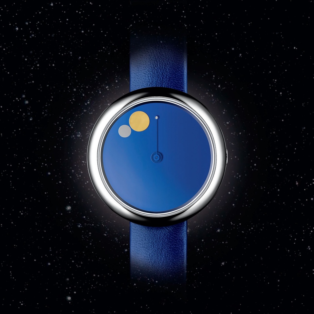 Круглый полированный корпус новинки изготовлен из нержавеющей стали, диаметром 40,0 мм, толщиной 10,5 мм, водонепроницаемый до 30 метров. Заводная головка, расположенная на 3 часах, полностью интегрирована в корпус. Выпуклое сапфировое стекло с антибликовым покрытием защищает циферблат синего цвета, без разметки. Модель оснащена модифицированным швейцарским автоматическим механизмом ETA, на 21 камне, с балансовой частотой 28800 полуколебаний в час (4 гц), 46-часовым запасом хода, функциями индикации часов (посредством соответствующего указателя в виде относительно крупного диска золотого цвета, двигающегося по периферии циферблата), минут (посредством аналогичного указателя меньшего диаметра, серебряного цвета) и секунд (посредством соответствующего указателя в виде крошечного бриллианта на конце центральной стрелки синего цвета). Эти указатели по заявлению автора модели, символизируют, соответственно, Солнце, Луну и Венеру. Поставляется на синем ремешке. Источник: http://www.astarwatch.ch/ |