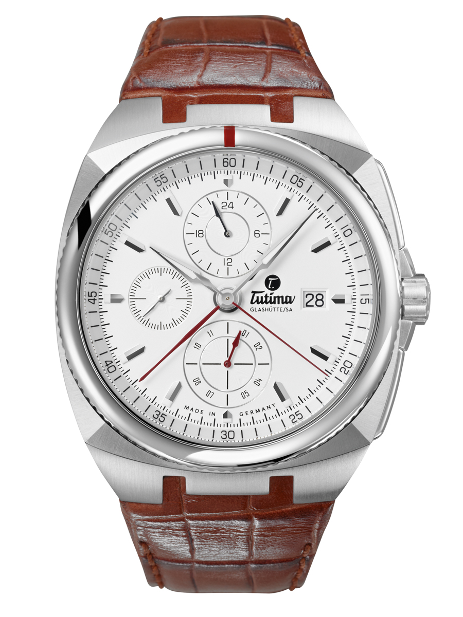 Новинка имеет корпус, изготовленный из нержавеющей стали, диаметром 44,0 мм, водонепроницаемый до 100 метров. На торце завинчивающейся защищенной рифленой заводной головки, расположенной на 3 часах и "притопленной" в корпус, выгравирован логотип бренда Tutima. Пушеры хронографа размещены на 2 и 4 часах. Сапфировое стекло установлено на передней стороне корпуса (с антибликовым покрытием) и на его задней крышке. Циферблат серебристого или антрацитового цвета, с накладными часовыми индексами, часовой и минутной стрелками, покрытыми белым люминесцентным составом. Модель оснащена модифицированным швейцарским автоматическим механизмом ETA Valjoux 7750, с функциями индикации часов, минут (посредством соответствующих центральных стрелок), секунд (на малом боковом циферблате, расположенном на 9 часах), даты (посредством соответствующего цифрового указателя в апертуре, расположенной на 3 часах), времени в 24-часовом формате (на малом боковом циферблате, расположеннои на 12 часах), а также с хронографом (центральные секундная и минутная стрелки, а также 12-часовый счетчик, расположенный на 6 часах). Поставляется на черном или на коричневом ремешке из кожи аллигатора с раскладной застежкой из нержавеющей стали. Цена модели составляет 4600 евро. Источник: http://www.watchtime.net/nachrichten/tutima-saxon-one/ |