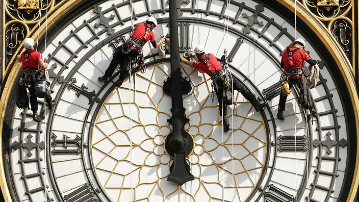 Команда мойщиков из четырёх человек поднялась на высоту шестидесяти метров, чтобы очистить циферблат знаменитой башни в столице Великобритании.