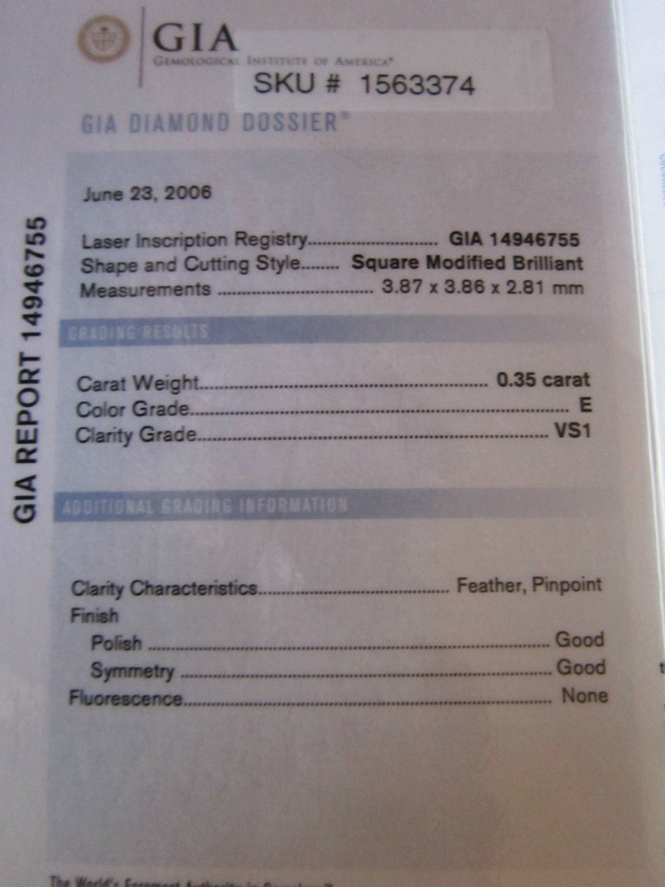 Белое золото 750 пробы Бриллиант огранки "Принцесса" весом 0,35 карат, цвет E (2), чистота VS1 (4) Размер 17,3 (меняется) Характеристики указаны на основе сертификата GIA #14946755 от 23.06.2006, гравировка на камне Цена $1500, возможен обмен на часы. Подарочный бокс в комплекте. Предложения в Л.С. Доставка по РФ. Вложение 776299 Вложение 776300 Вложение 776301 Вложение 776302 |