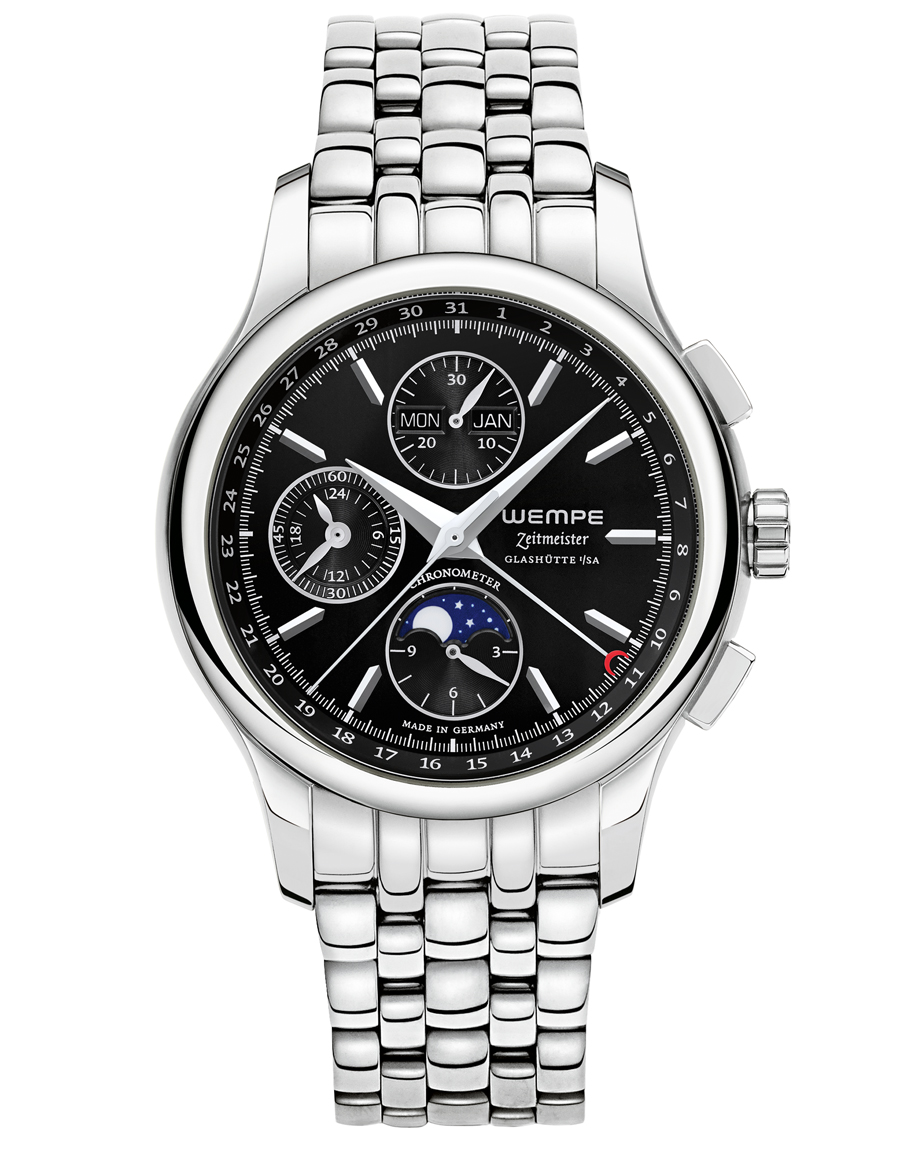 Новая сложная модель Zeitmeister Chronograph Vollkalender Mondphase от Wempe (знаменитая немецкая сеть магазинов по продаже часов и ювелирных изделий, выпускающая часы под собственным брендом, в т.ч. Wempe Zeitmeister и Wempe Chronometerwerke), как это и следует из ее названия, усложнена функциями вечного календаря и индикации фаз Луны.
