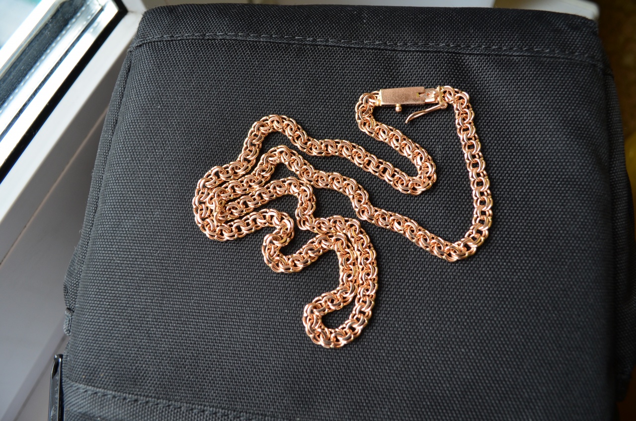 Продаю золотую цепочку 585 пробы,плетение бисмарк-кардинал,смотрится солидно,тип замка-коробочка с фиксирующей петлей-очень надежная.Вес 30.3 гр.,длина 58 см.,ширина 6 мм.Цена 48000 ВОЗМОЖЕН НЕБОЛЬШОЙ торг.Цепочка в Новосибирске.Фото прилагаю
