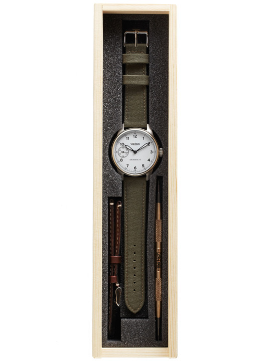 Первой моделью, выпущенной молодым брендом, является Standard Issue Field, дизайн которой выполнен в винтажном милитари-стиле. Ее круглый корпус изготовлен из нержавеющей стали, диаметром 42,0 мм, толщиной 12,8 мм, водонепроницаемый до 100 метров, 20-миллиметровым расстоянием между ушками. Завинчивающаяся рифленая заводная головка расположена на 3 часах. Сапфировое стекло установлено на передней стороне часового корпуса и на его завинчивающейся задней крышке. Циферблат матово-черного или молочно-белого цвета, с белыми или черными арабскими цифрами, а также с черными воронеными стальными часовой и минутной стрелками, покрытыми люминесцентным составом SuperLuminova белого цвета. Модель оснащена швейцарским механизмом с ручным заводом Weiss 1001 (базовый калибр ETA 6497), на 17 камнях, с балансовой частотой 18000 полуколебаний в час (2,5 гц), 46-часовым запасом хода, функциями индикации часов, минут (посредством соответствующих центральных стрелок) и секунд (на малом боковом циферблате, расположенном на 9 часах). Поставляется на оливково-зеленом холщевом ремешке с застежкой из нержавеющей стали. MSRP модели составляет $ 950. Вложение 788723Вложение 788724Вложение 788725 Вложение 788726 Вложение 788728 Вложение 788730 Источник: http://forums.timezone.com/index.php...=0#msg_6859418 |