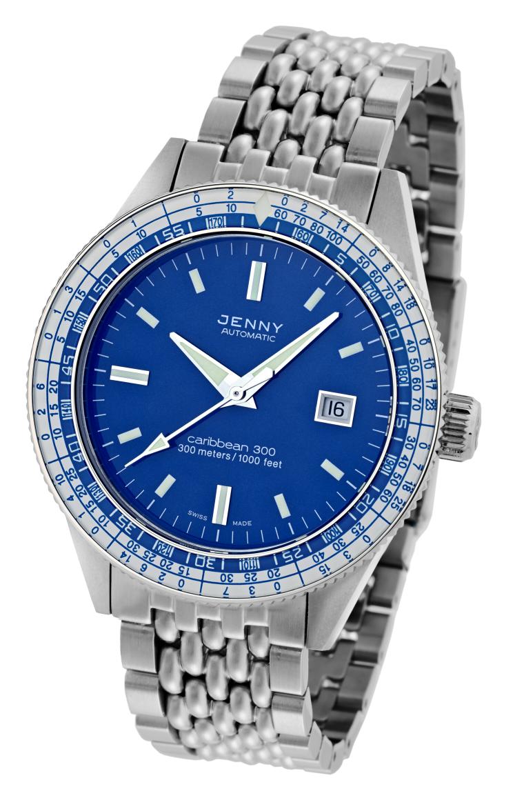 Сегодня возрожденная компания выпустила свою новую лимитированную модель Caribbean 300. Круглый сатинированный корпус новинки изготовлен из нержавеющей стали, диаметром 42,0 мм, толщиной 12,3 мм, водонепроницаемый до 300 метров. На торце завинчивающейся рифленой заводной головки, расположенной на 3 часах, выгравирован логотип бренда Jenny. Вращающийся однонаправленный запатентованный безель с сапфировым покрытием, разметка на котором отображает декомпрессионную таблицу (предельное время декомпрессии для дайвера в зависимости от времени и глубины погружения). Сапфировое стекло с антибликовым покрытием защищает циферблат синего, серебристого, оранжевого и черного цвета с оранжевым безелем, а также черного цвета с желтым безелем. Накладные часовые индексы покрыты, как и стрелки, люминесцентным составом белого цвета. Модель оснащена швейцарским автоматическим механизмом ETA 2824-2 (версии Топ Elaboree, с гравированным ротором), на 25 камнях, с балансовой частотой 28800 полуколебаний в час (4 гц), запасом хода 42 часа, функциями индикации часов, минут, секунд (посредством соответствующих центральных стрелок) и даты (посредством соответствующего цифрового указателя в апертуре, расположенной на 3 часах). Поставляется на браслете из нержавеющей стали и с каучуковым ремешком с застежкой из нержавеющей стали. Лимитированный выпуск по 500 экземпляров в каждом цвете. MSRP модели составляет $ 990. Источник: http://forums.timezone.com/index.php...=0#msg_6888090 |