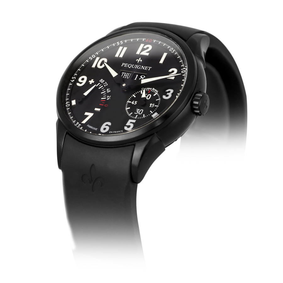 Модель оснащена мануфактурным французским автоматическим механизмом Pequignet Royal, на 38 камнях, с балансовой частотой 21600 полуколебаний в час (2 гц), 88-часовым запасом хода, функциями индикации часов, минут (посредством соответствующих центральных стрелок) секунд (на малом боковом циферблате, расположенном на 4 часах), дня недели и даты (посредством соответствующих буквенного и цифрового указателей в апертурах, расположенных на 11 и 13 часах) и запаса хода (посредством соответствующего аналогового указателя, расположенного на 8 часах). Поставляется на черном резиновом ремешке. Цена модели составляет 7500 евро. Вложение 833412 Источник: http://www.watchtime.net/nachrichten...-calibre-noir/ |