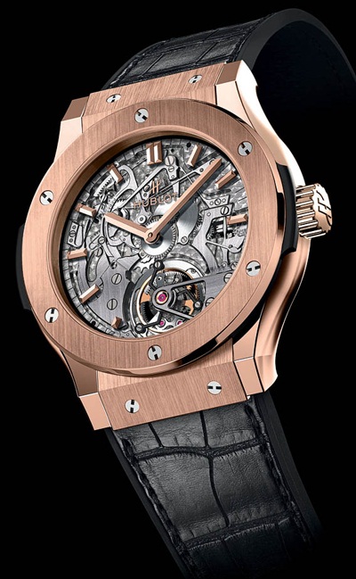 В эту пятницу, в Женевском Большом театре, состоялось вручение главной премии в области Высокого часового искусства – Женевского Гран-при [об итогах Grand Prix d’Horlogerie de Genève 2014 см. на нашем форуме здесь. Ego]. Эту статью мы хотели бы посвятить часам, которые были признаны лучшими в категории «Часы с механизмом боя». Речь идет о модели Hublot Classic Fusion Cathedral Tourbillon Minute Repeater. Стоит отметить, что это уже второй мануфактурный репетир с турбийоном, представляемый маркой Hublot. В этой модели найден правильный баланс между классическими усложнениями, ставшими символом часового искусства, и динамичным современным дизайном корпуса Classic Fusion диаметром 45 мм. Это потрясающий урок стиля, демонстрирующий гармоничное слияние традиции и современности.