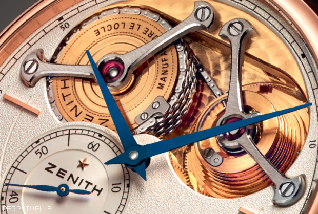 Но внимание ценителей часового искусства привлечет прежде всего окошко в верхней части циферблата, позволяющее увидеть цепную передачу и барабан на отметке «10 часов 30 минут», а на отметке «1 час 30 минут» – фузею, на которую наматывается цепь. Для того чтобы цепь полностью намоталась на барабан, требуется более 50 часов, что и составляет запас хода механизма. В течение всего нескольких секунд, необходимых для завода часов, можно увидеть, как фузея и заводной барабан вращаются в направлении, противоположном направлению хода, до тех пор, пока цепь не намотается на фузею. Два моста, закрепленных на платине с помощью винтов, фиксируют ось фузеи и ось барабана, напоминая конструкцию часов конца XIX века. На барабане выгравированы надписи Zenith / Manufacture Le Locle.