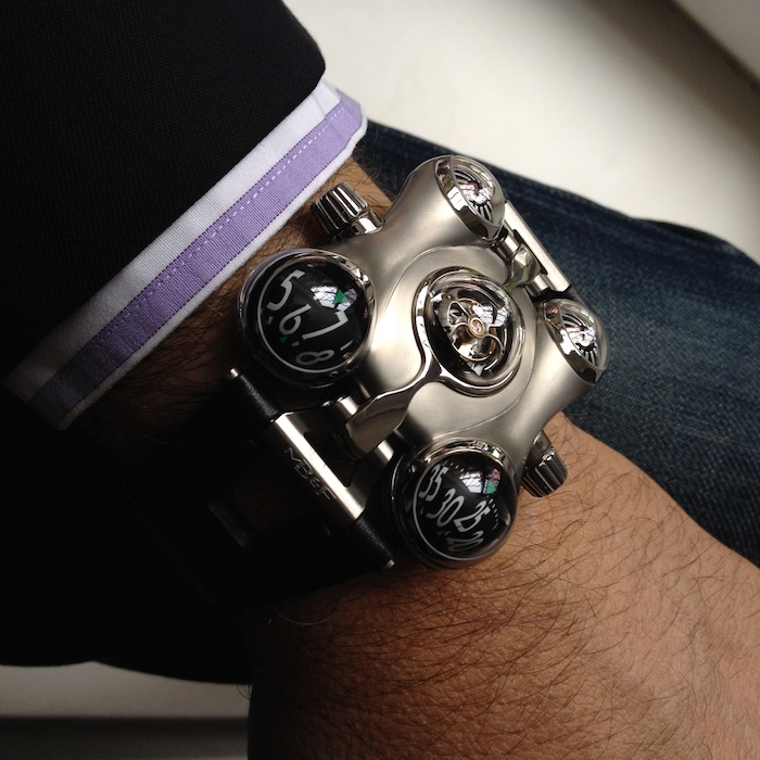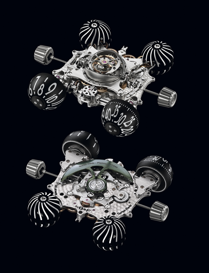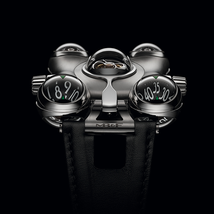 Сегодня Максимилиан Бюссер представил свои новые часы, как всегда сложно устроенные и безумно дорогие. Но основной посыл очередной «машины времени» не материален, с ее помощью основатель MB&F перенес остолбеневших зрителей во времена своего детства и рассказал очень простую вещь — ему, как и всем его сверстникам, нравилось смотреть мультфильмы. По признанию Бюссера, глубокий след в его воспоминаниях оставил сериал Capitaine Flam, в котором у главного героя был космический корабль «Комета», состоявший из двух соединенных между собой сфер. Именно он стал прообразом Horological Machine №6. Часы получили соответствующий этой истории никнейм — Space Pirate.