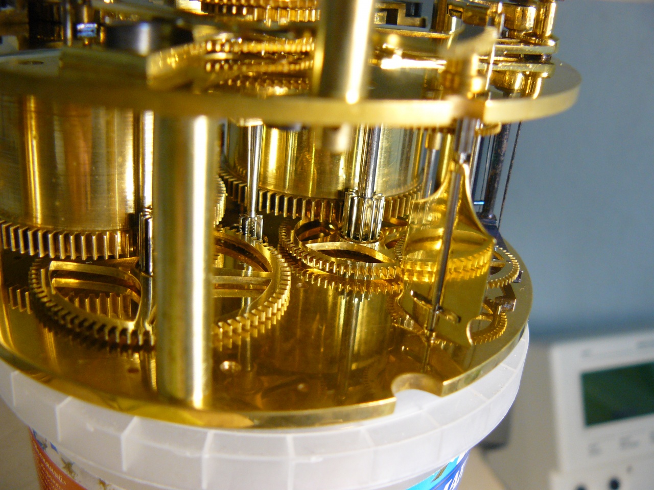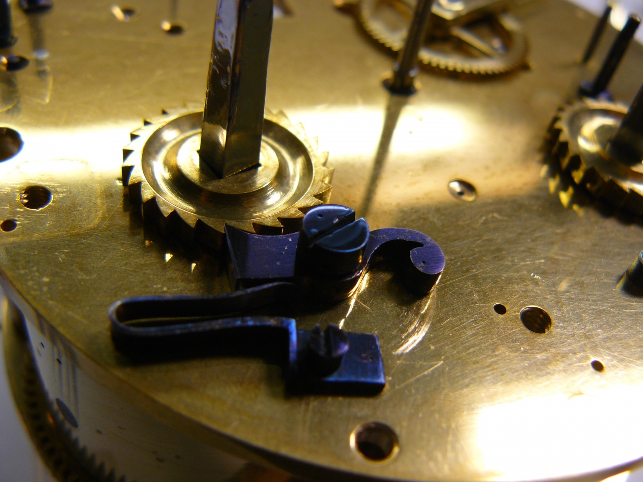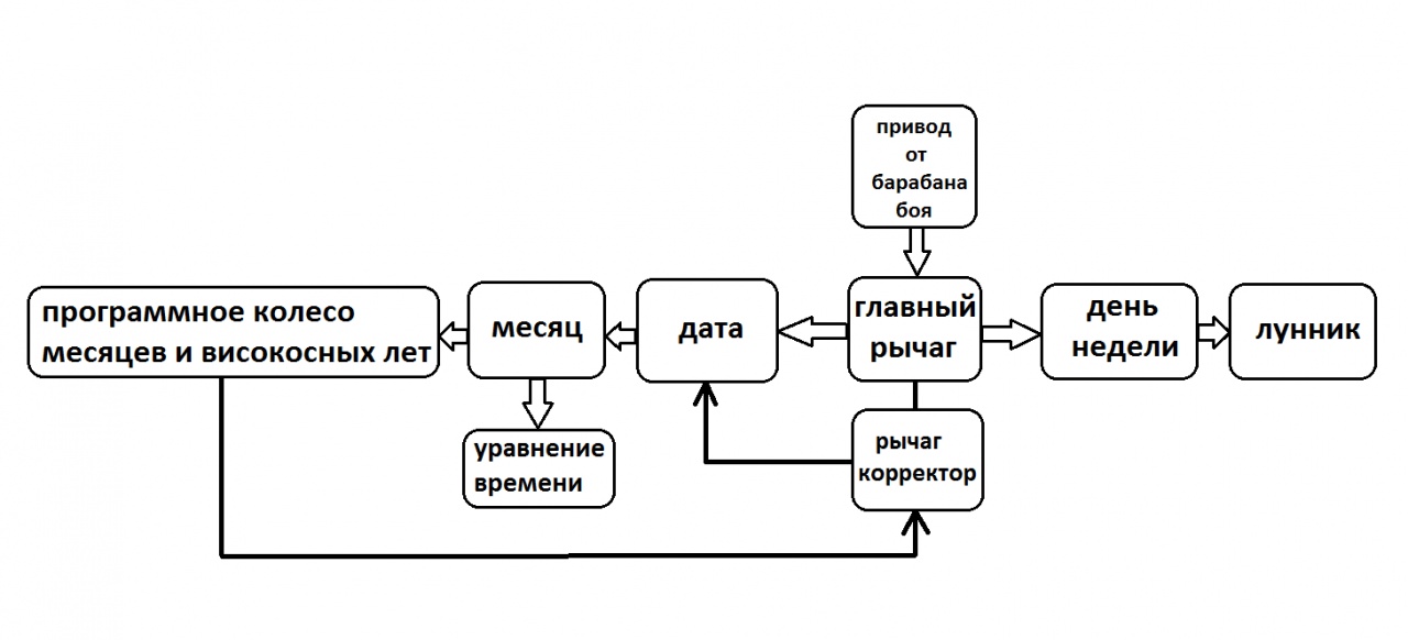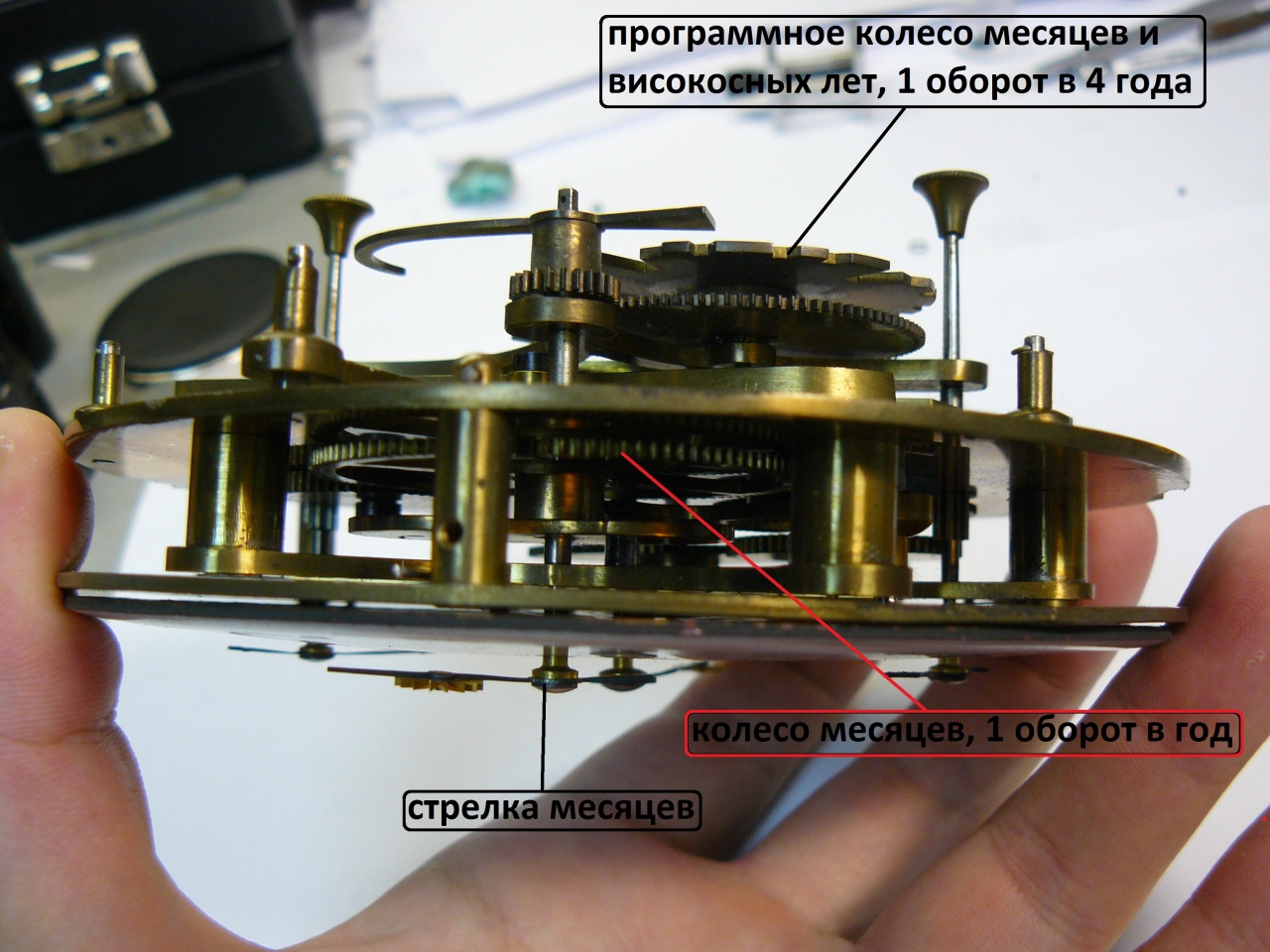 How it works теперь о том, как это устроено привод календаря осуществляется от механизма боя, поэтому чтобы календарь работал, бой нужно заводить всегда Вложение 841767 на вал отбора мощности насажен диск с штифтом, который делая 1 оборот в сутки, отводит главный рычаг календаря, взводя его, затем главный рычаг срывается со штифта под действием возвратной пружины и мгновенно переводит звездочки даты и дня недели на 1 зуб Вложение 841768 Вложение 841769 колеса (или звездочки) даты и дня недели каждая имеют на своей оси триб, который находится под платиной механизма триб колеса даты приводит в движение колесо месяцев триб колеса дня недели приводит в движение диск фаз луны, причем передаточное отношение подобрано таким образом, что в отличие от простых лунников, этот накапливает ошибку более чем за 100 лет Вложение 841770 на колесе месяцев жестко насажен кулачок специально рассчитанного профиля, который отвечает за показания стрелки уравнения времени колесо месяцев делает 1 оборот в год, зубчатый сектор скользя своим штифтом по боковой поверхности кулачка, приводит в движение колесо стрелки уравнения времени итак, календарь показывает дату, день недели, месяц, фазы луны и уравнение времени но что же делает его "вечным"? здесь начинается самое интересное ось колеса месяцев имеет триб, который вращает программное колесо месяцев и високосных лет Вложение 841771 программное колесо, колесо месяцев и колесо дат должны быть четко синхронизированы между собой, поэтому на них имеются синхронизационные метки, как на колесах ГРМ в двигателе внутреннего сгорания Вложение 841782Вложение 841783Вложение 841784 благодаря этим меткам правильно собрать механизм сможет даже ребенок программное колесо делает 1 оборот за 4 года, оно размечено на 4 равных сектора, каждый из которых имеет вырезы в определенной последовательности, отвечающие за продолжительность месяцев 3 сектора абсолютно идентичны, четвертый имеет менее глубокий вырез, отвечающий за февраль в високосном году Вложение 841772 на главном рычаге есть ось, на которой стоит рычаг-корректор, а на колесе даты есть штифт-корректор рычаг корректор скользит контрольным штифтом по поверхности программного колеса Вложение 841801 если месяц стандартной длины 31 день, штифт корректор скользит по максимальному радиусу колеса, и рычаг корректор не опускается достаточно низко, чтобы зацепить штифт-корректор на колесе даты но если в месяце 30 дней , контрольный штифт попадает в вырез программного колеса, и рычаг корректор опускается в зону взаимодействия с контрольным штифтом колеса дат, контрольный штифт походит к рычагу при наступлении 30-го числа, далее, через сутки,когда главный рычаг проходит цикл взвода, рычаг-корректор зацепляет штифт своим уступом и переводит на 1 щелчок, на 31 число, ; когда главный рычаг совершает рабочий ход, дата переводится еще на 1 щелчок в штатном режиме, на 1 число следующего месяца при окончании Февраля рычаг-корректор переводит колесо даты на 3 щелчка в обычном году, и еще на один щелчок колесо дат переводит главный рычаг при рабочем ходе в Феврале високосного года рычаг корректор переводит колесо на 2 щелчка количество щелчков, на которое рычаг-корректор переведет колесо дат, определяется глубиной выреза в программном колесе, чем глубже вырез, тем ниже опускается рычаг-корректор, тем раньше вступ