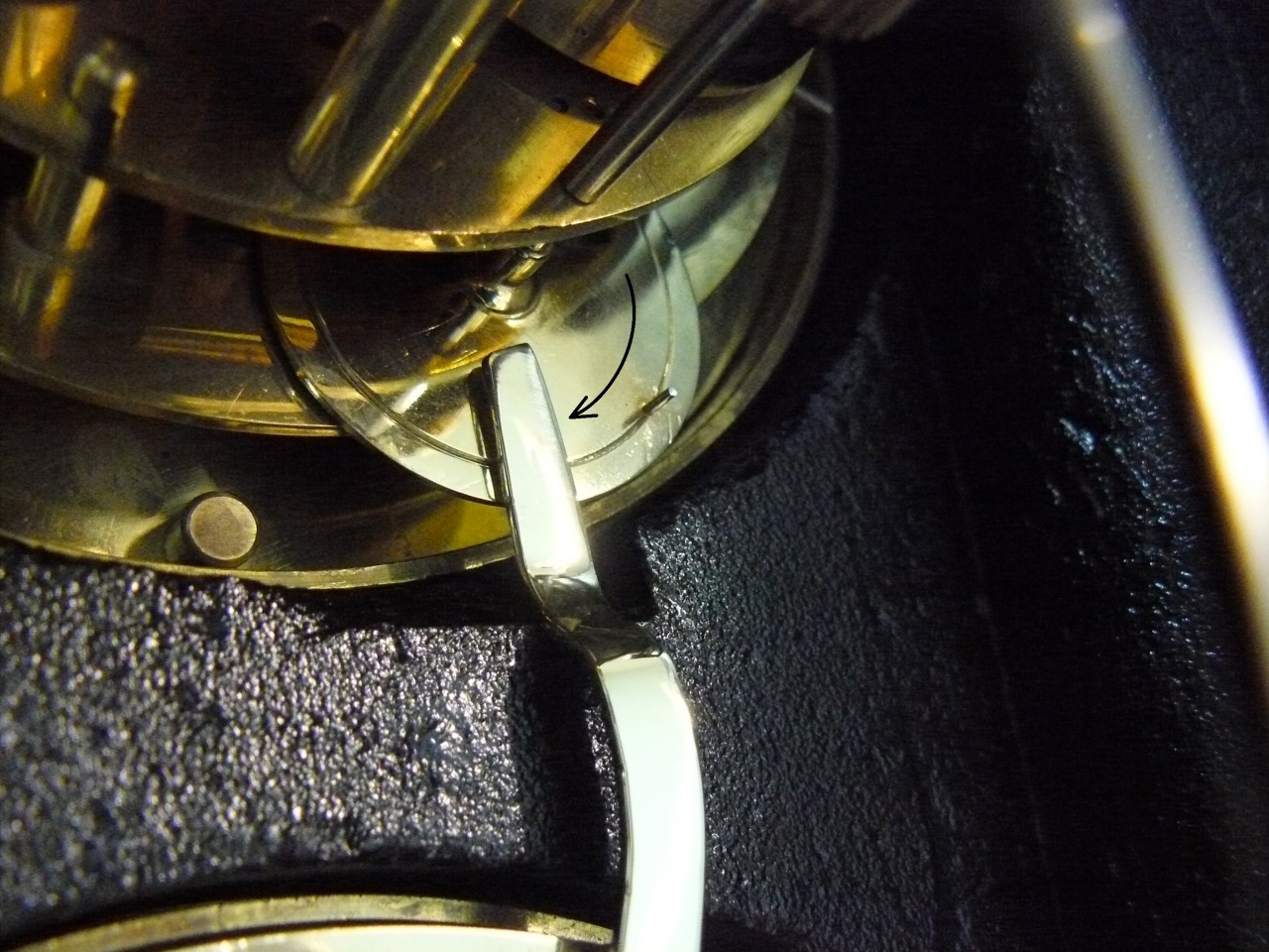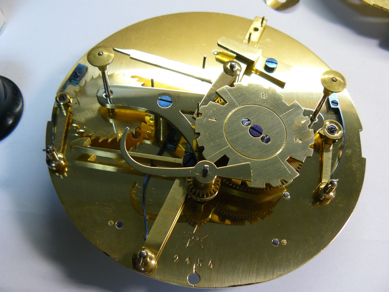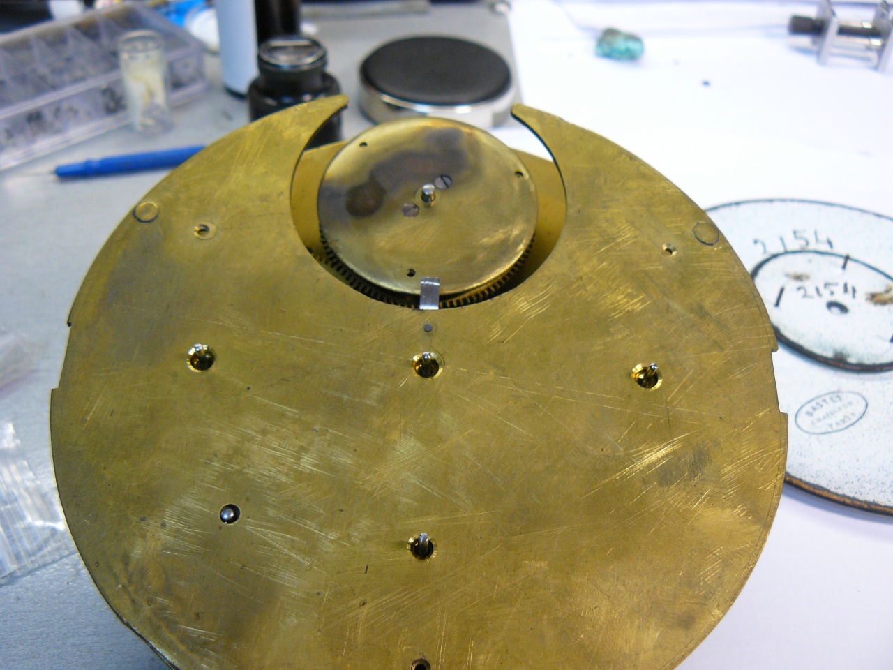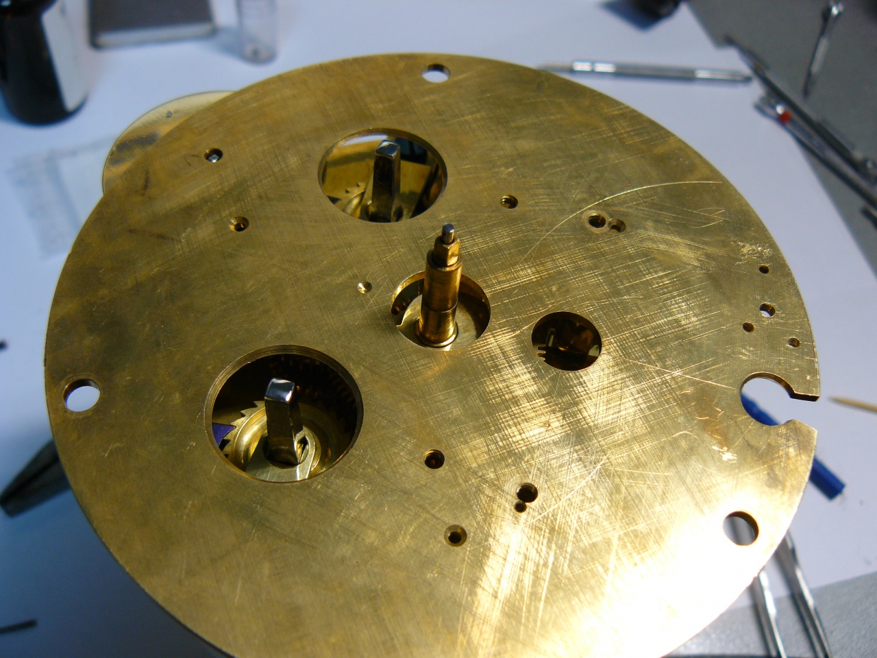 т.к. я имел небольшой опыт с наручными вечниками IWC и Улисс Нардин, то взялся привести в порядок эти часы несколько фото состояния "до": Вложение 841682Вложение 841683Вложение 841684 Вложение 841685Вложение 841686Вложение 841687 фото не передают всех проблем, в частности проблем с корпусом в нижней части, сегменты камня волнообразного профиля были приклеены неровно, и их пришлось отдирать, счищать клей и приклеивать назад ровно один сегмент был раскрошен на несколько кусочков, которые так же были склеены очень грубо Вложение 841688 а прямоугольный сегмент был когда-то утерян и заменен фанерной дощечкой Вложение 841689 здесь я очистил осколки от старого клея и приклеил их к сегменту Вложение 841690 покраска корпуса изнутри Вложение 841691 к сожалению, в нашем селе никто не смог вырезать пластину из сланца точного размера и толщины, поэтому утерянный сегмент был заменен вырезанным в размер кусочком черной кафельной плитки, торцы которой были покрашены черной краской из баллончика получилось довольно аккуратно, жаль нет фото переходим к механической части: сломанный пендельфедер - классика жанра Вложение 841692 был изготовлен новый пендельфедер из щупа Вложение 841693Вложение 841694 испытание нового подвеса на "виляние" Вложение 841695 стрелки тоже в плачевном состоянии, причем минутная - самодельная Вложение 841696Вложение 841697 я решил заменить самодельную минутную стрелку самодельной стрелкой своего изготовления, сделанной по образцу часовой (подробнее ТУТ) Вложение 841701Вложение 841702Вложение 841703Вложение 841704Вложение 841705Вложение 841706 Вложение 841707Вложение 841708Вложение 841709 в механизме было несколько изношенных цапф и отверстий здесь виден износ отверстия в мостике колеса боя Вложение 841710Вложение 841711Вложение 841712 выход - ставить футор Вложение 841713Вложение 841714Вложение 841715 далее нужно сделать лунку для масла и все отполировать Вложение 841716Вложение 841717 другие вставленные футора Вложение 841718Вложение 841719 цапфы колес также подвергаются износу, поэтому должны быть приведены в порядок фото из нета изношенной цапфы Вложение 841720 цапфы были обточены до цилиндрической формы и отполированы до зеркального блеска вот фото некоторых Вложение 841721Вложение 841722Вложение 841724 пружины были вынуты для чистки и инспекции Вложение 841729 отверстия в пружинах под зацеп в барабане были обточены изнутри, чтобы убрать начавшие зарождаться трещины, затем кромки отверстий были отполированы, чтобы снизить риск возникновения новых трещин |