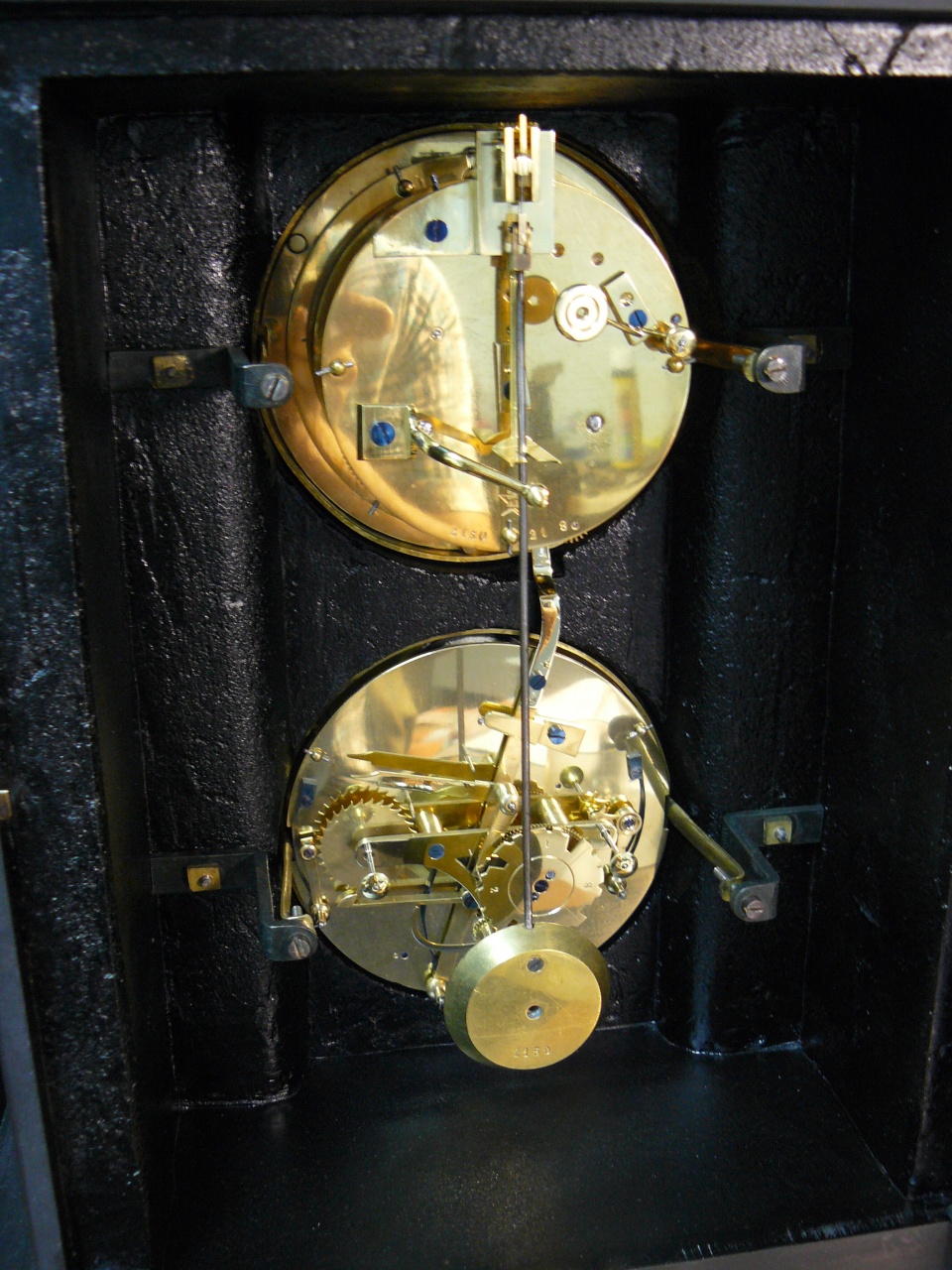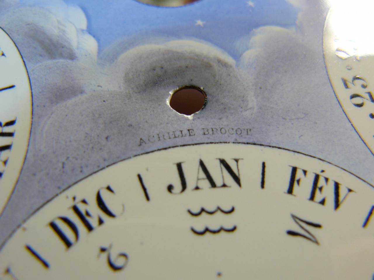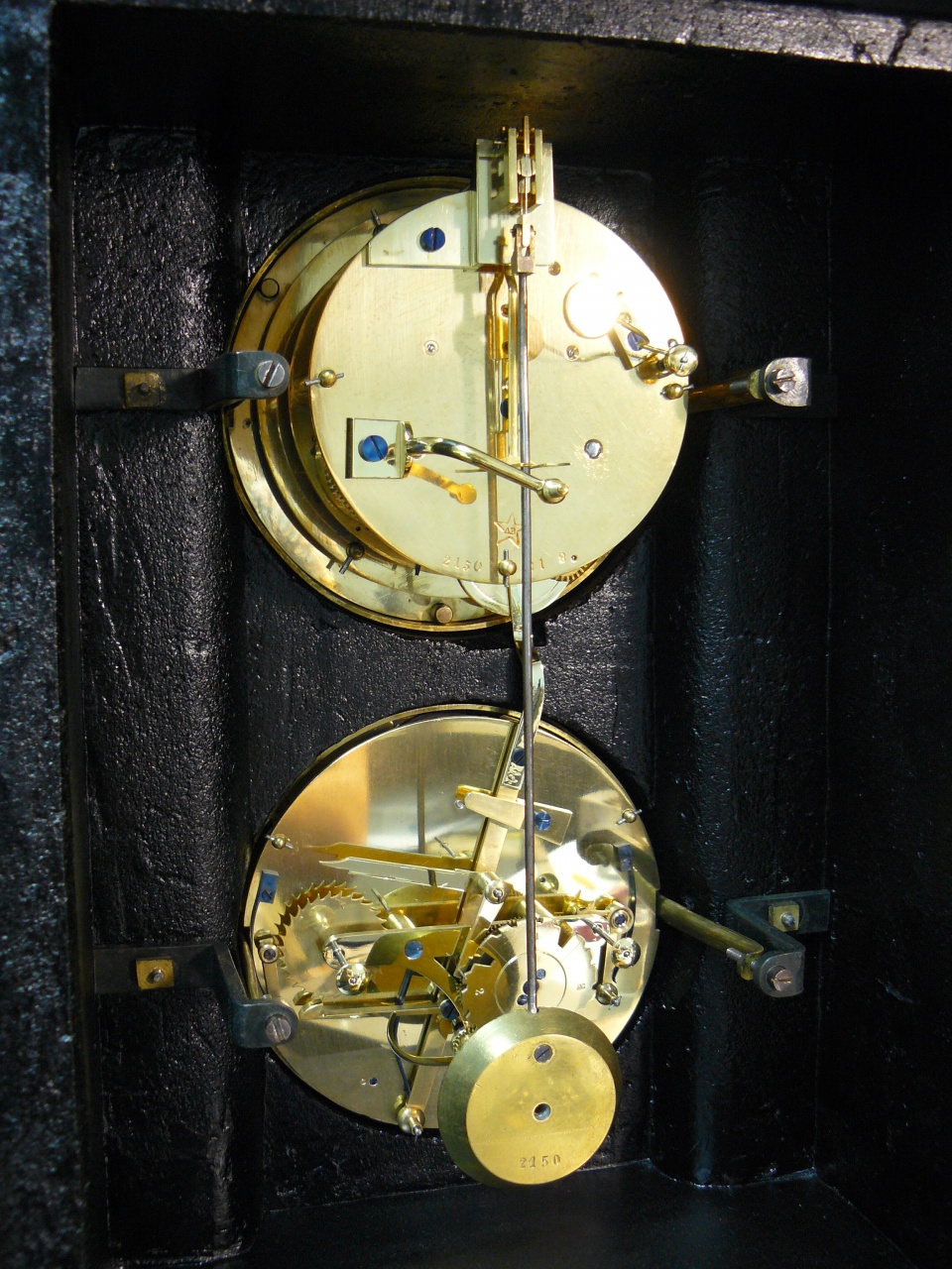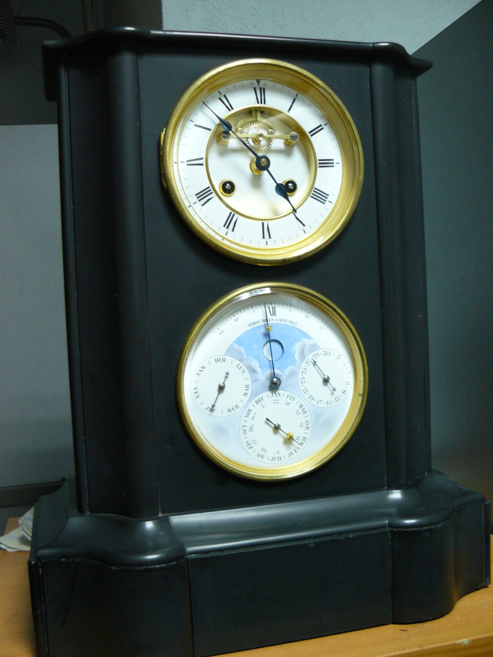 Прочитав сейчас отчет я первый раз увидел :eek: надпись Ahille Brocot над месяцами в календаре! Взял фонарик, очки - точно, есть! Теперь о ходе этих часов. Прошло 4 месяца после ремонта. Сначала они спешили до 1 мин 45 сек за 8 дней. Затем точной регулировкой хода над 12 часами я пролетел на отставание до 60сек за 21 день. Затем, по чуть-чуть крутя регулировку, отставание все уменьшалось и на сегодня я добился отставание в 2-3сек за 14 дней. Думаю, это достойная точность для таких часов. Замер всегда провожу на одном и том же делении 52 минуты, перед этим за пару минут на компе синхронизирую время с эталонным через инет. Завода пружин хода и боя хватает на 14 дней. Больше боюсь экспериментировать. |