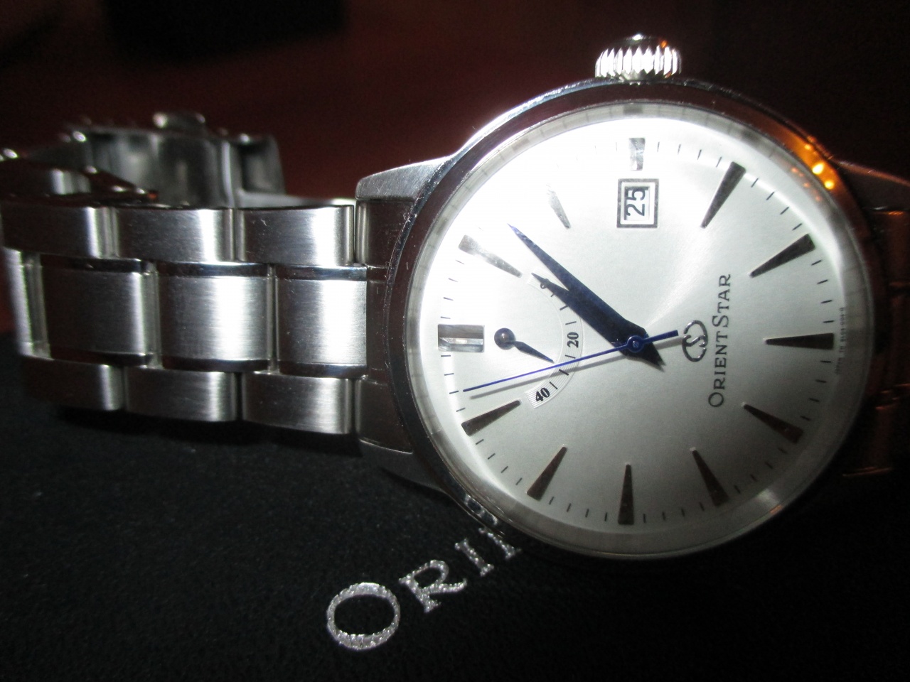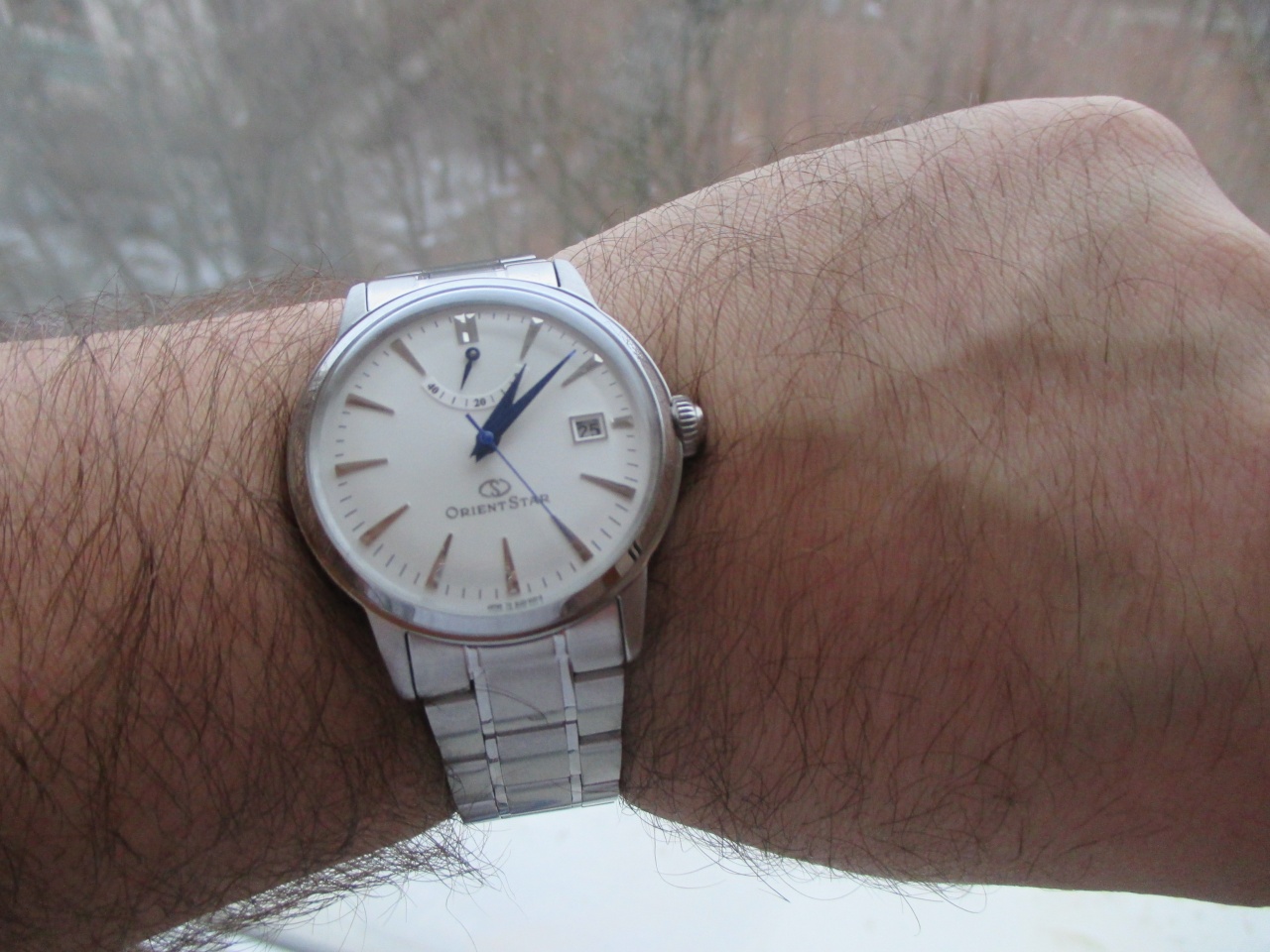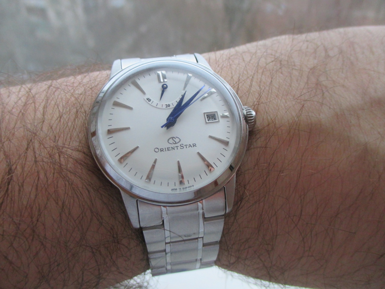 Вот опять часовая болезнь обострилась, теперь у меня живёт новый ориент:D Реф EL05003W Изначально хотел приобрести какой нибудь кварц, но слишком мне эти часики приглянулись. И вроде совсем простые, но воистину классика. Белый цифер с почти незаметными лучами из центра, синие стрелки в зависимости от освещения играющие от синевы до черноты. Дата тоже нормально что есть. Запас хода- отлично. Браслет сначала укоротил на звено, потом поставил обратно, укоротив длину переставив шпильку в пряжке. Удобно, не броско. wr 50 -для таких часиков самое оно, даже плавать можно. Отсутствие люма тоже не напрягло. Очень читаемый светлый циферблат с тёмными стрелами видно и в темноте. Порой люм под рукавом не заряжается и в нужный момент не светит. Тут этой проблемы просто нет. Уже проверил точность. Вроде всё хорошо. Вначале показалось что идут весьма вперёд, но по истечению суток наверно секунд на 5-10 всего спешат. Ещё там интересное стекло - выпуклое как на старых костюмниках. Минералка. В общем, часики здоровские.
